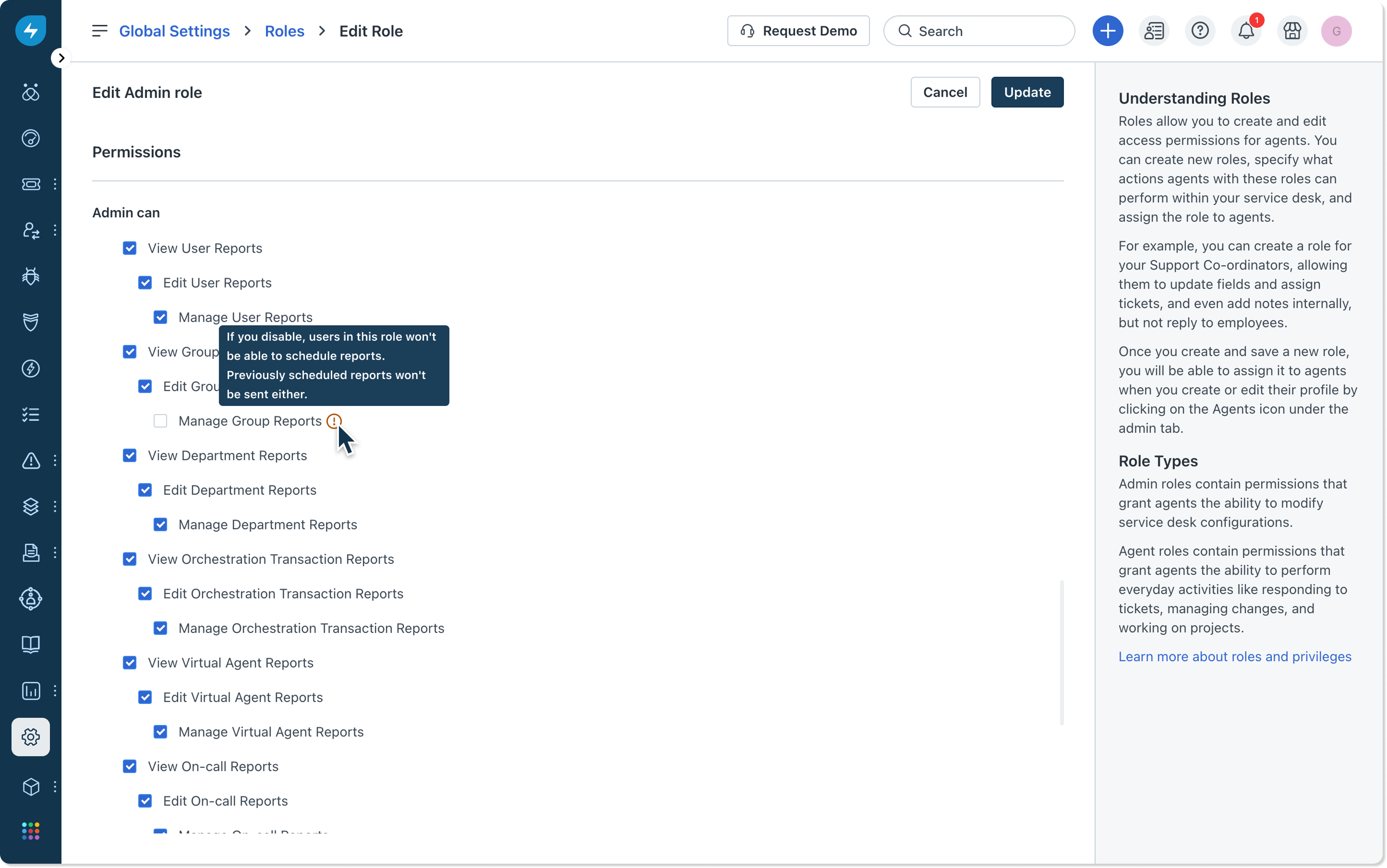 To assign an agent or admin Manage Reports permission, go to Global Settings > Roles > Edit Role > Reports > select Manage Reports permission. Agents with Manage Reports permission can do the following: