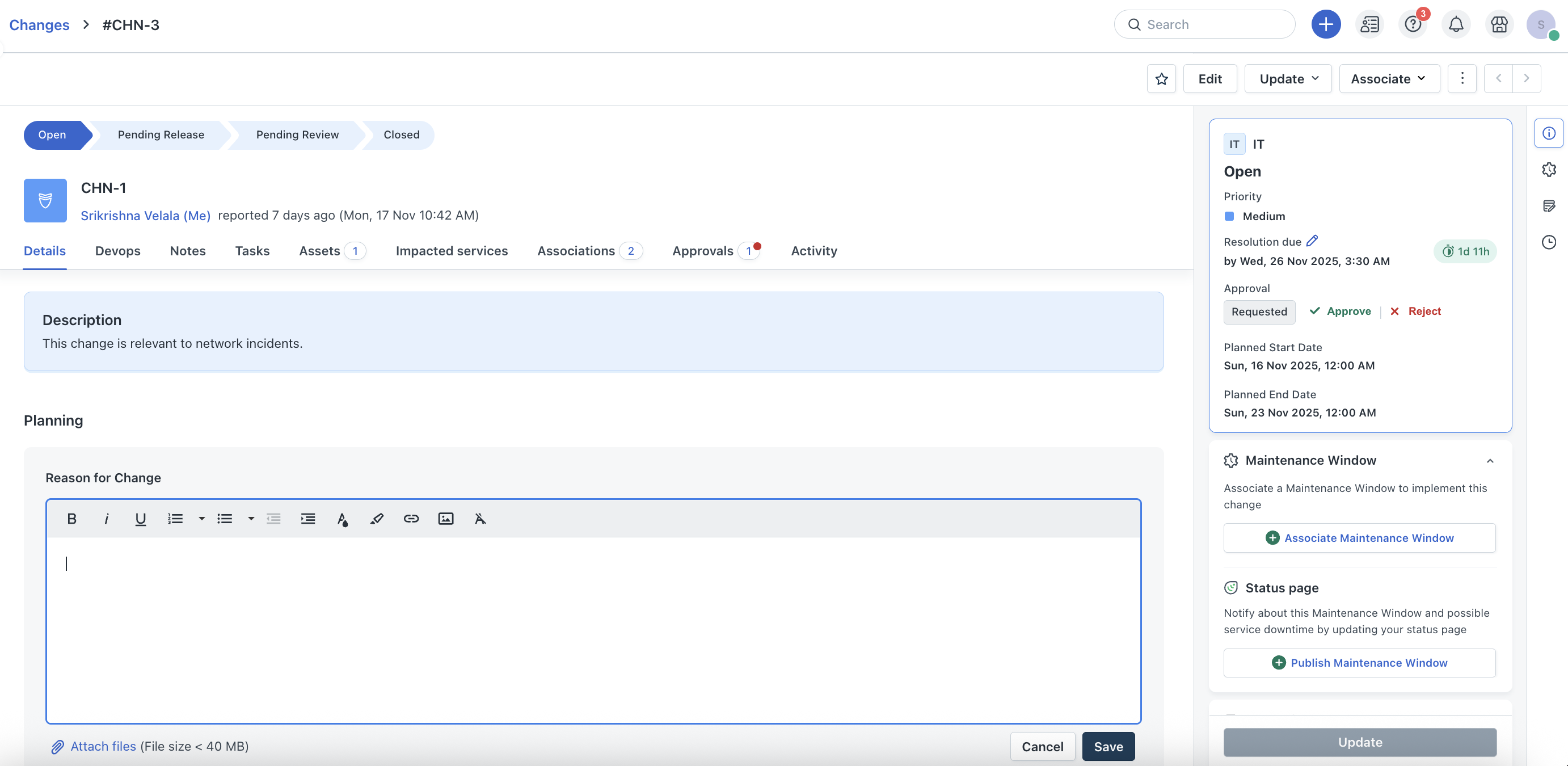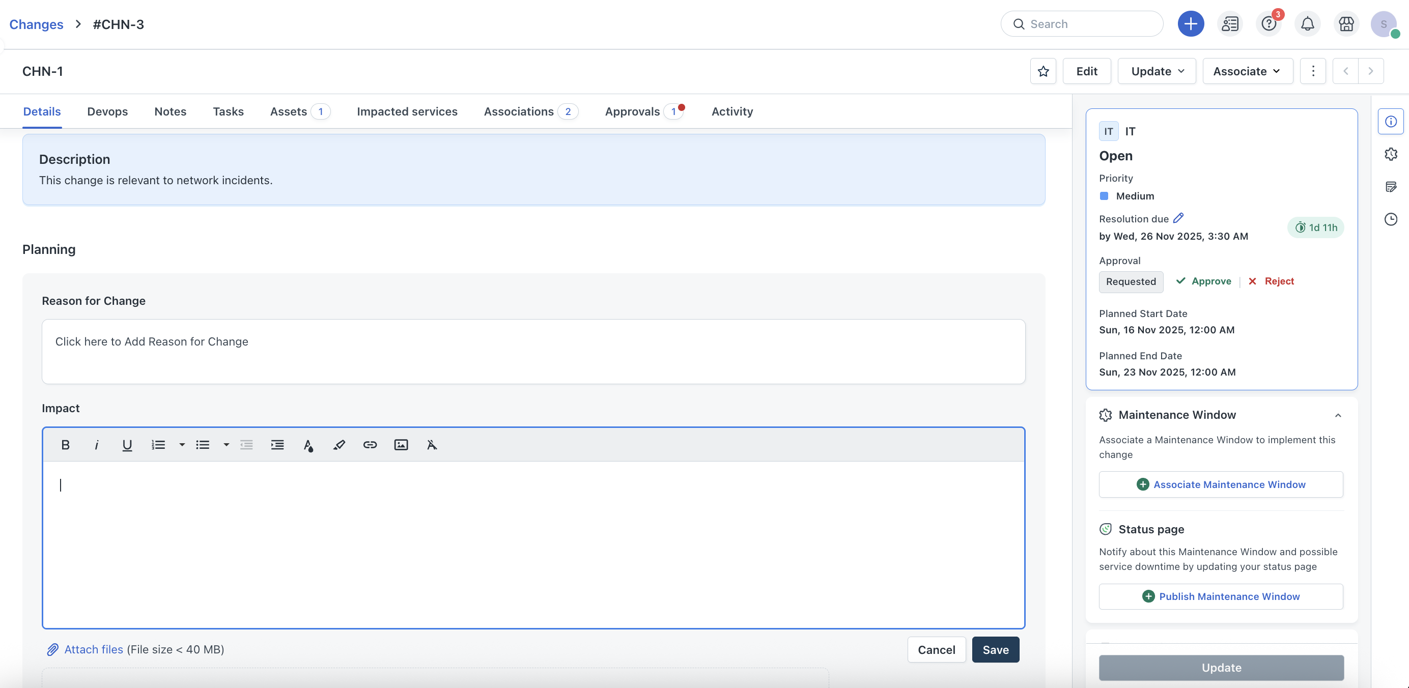 Note: You can update the Change Type, Priority, Impact, Risk, and Date fields under the Properties section on the right.