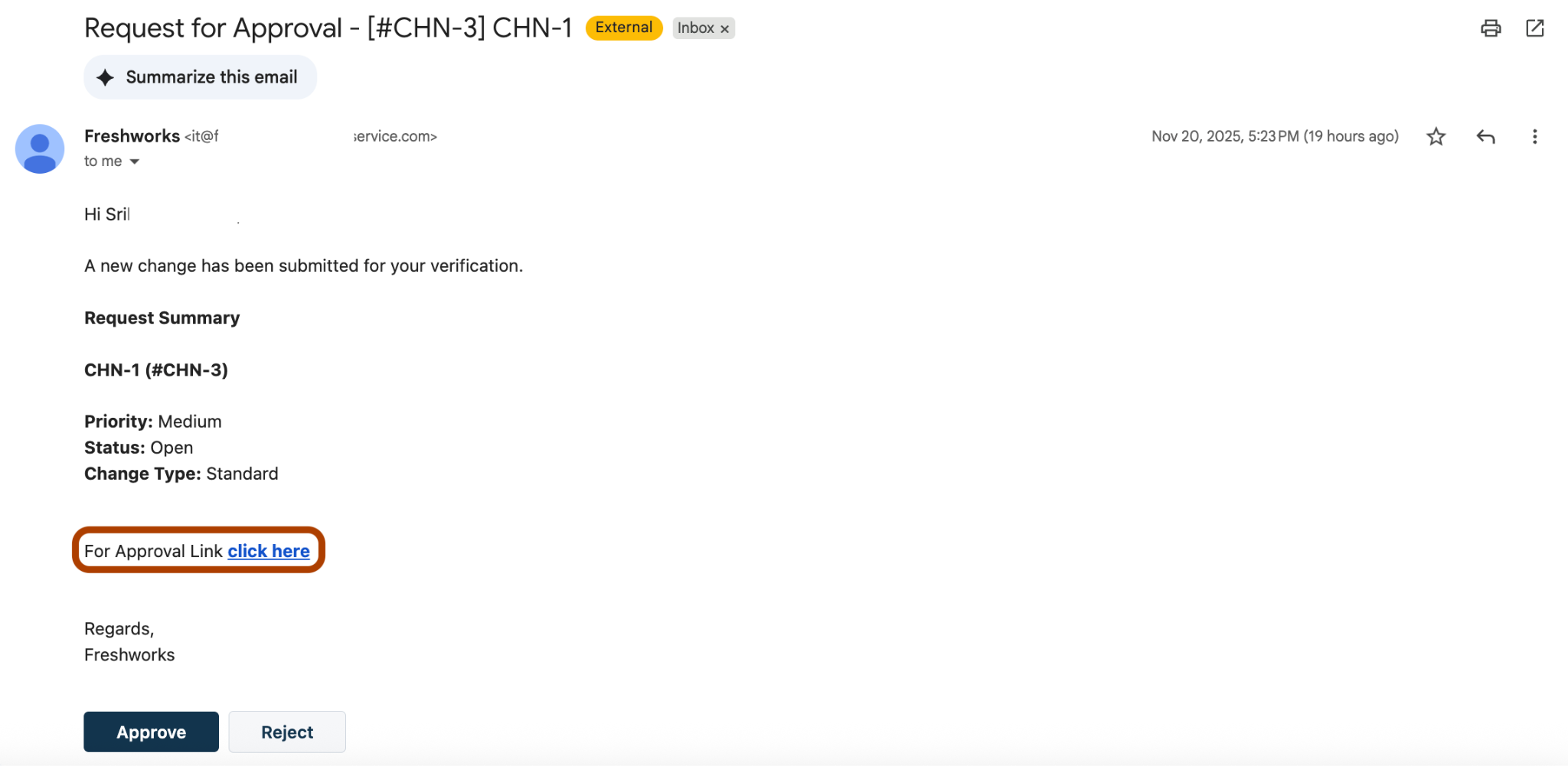 Click the link provided in the relevant email to open the Change details page in Freshservice.
