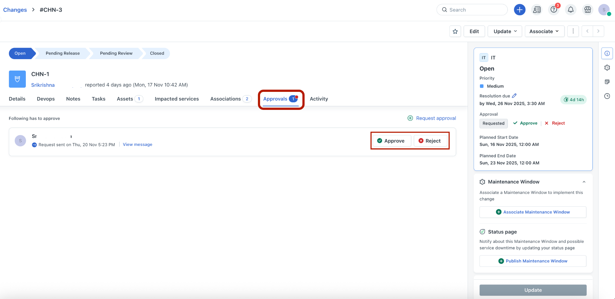 Note: In case of any queries on approval or rejection of the change, you can also add comments in the Notes tab.