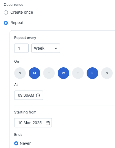 Repeat: Enter the date in the Starting form field to schedule the start date. For example, in the image below, the schedule will occur on Monday, March 10th at 9:30 am, then again on Wednesday, March 12th at 9:30 am, and so on.