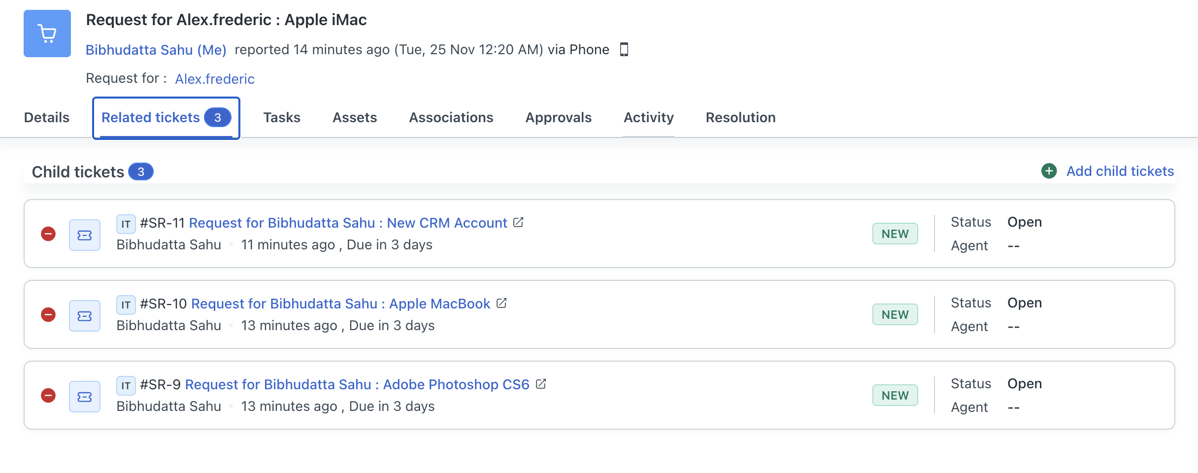 These child tickets (Ex: New CRM Account, Apple MacBook, and Adobe Photoshop CS6) will be linked to the parent ticket (New Employee Hire) and can be handled by agents in the respective departments or groups.