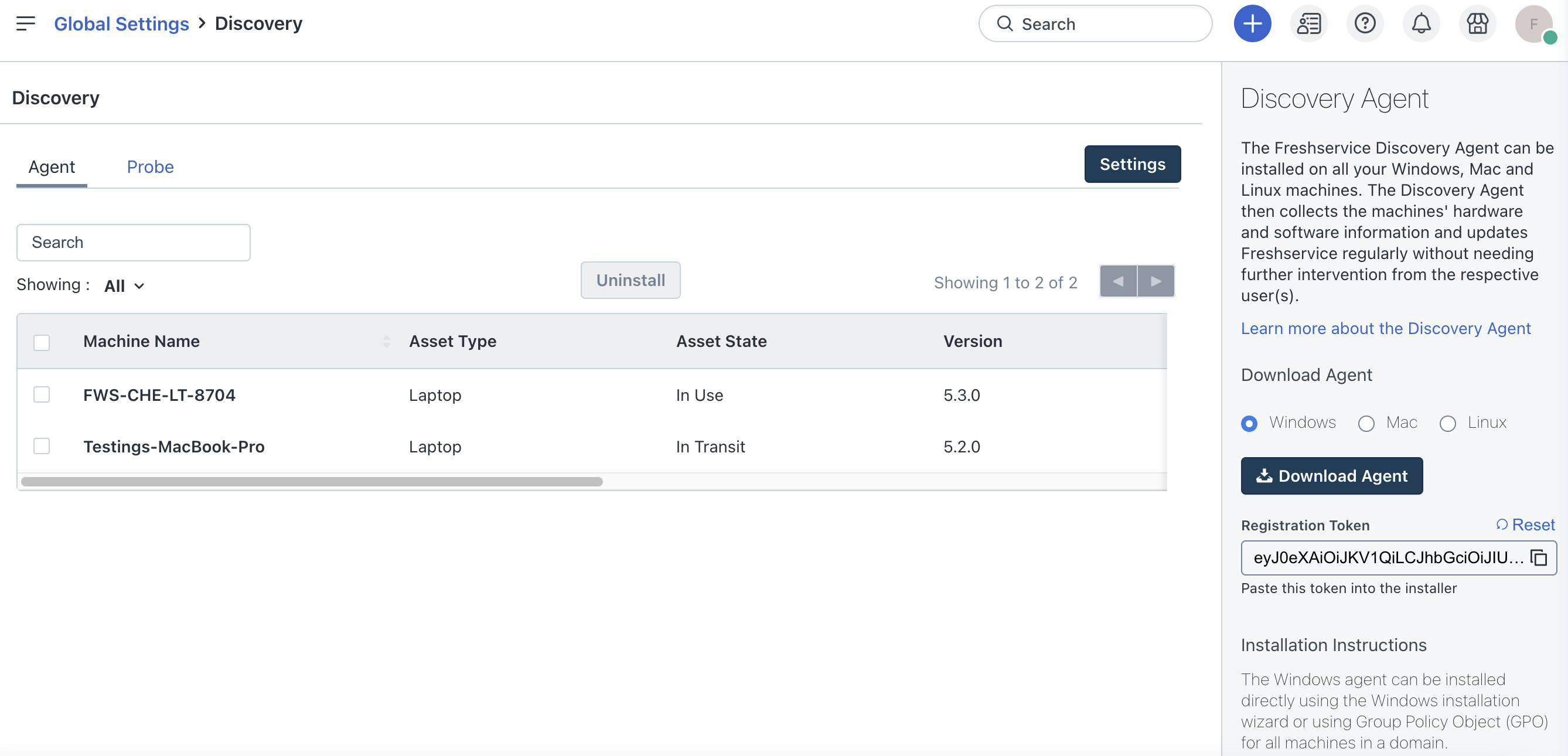 The Freshservice Discovery Agent can be installed on your Windows machines. The Discovery Agent then collects the machines' hardware and software information and updates Freshservice regularly without the need for further intervention from the respective users.