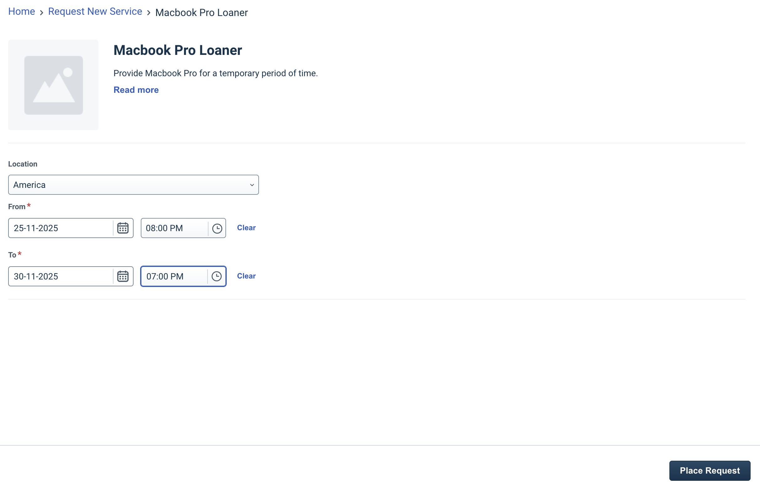 A requester can select a loaner asset on the Service Catalog page and fill in the following form to request for the loaner asset.