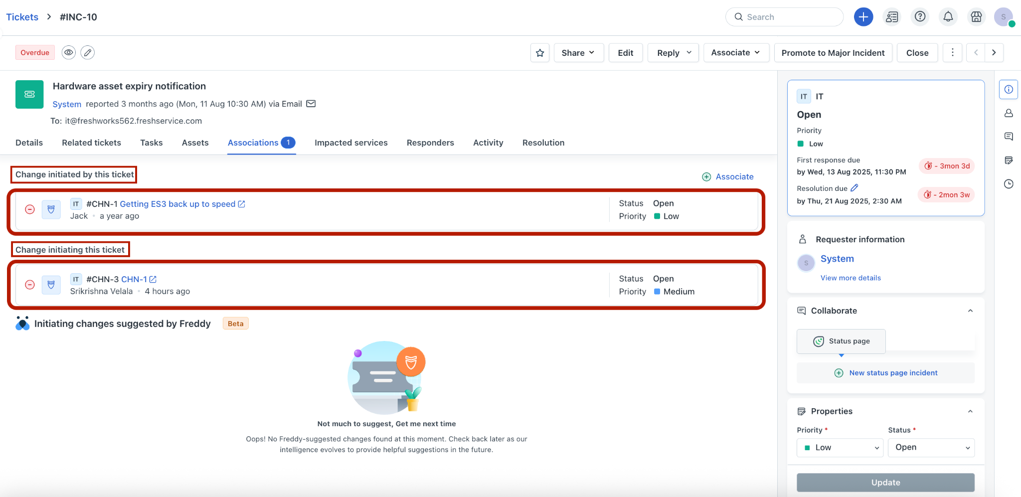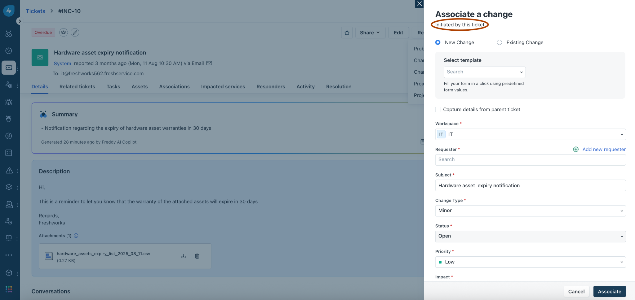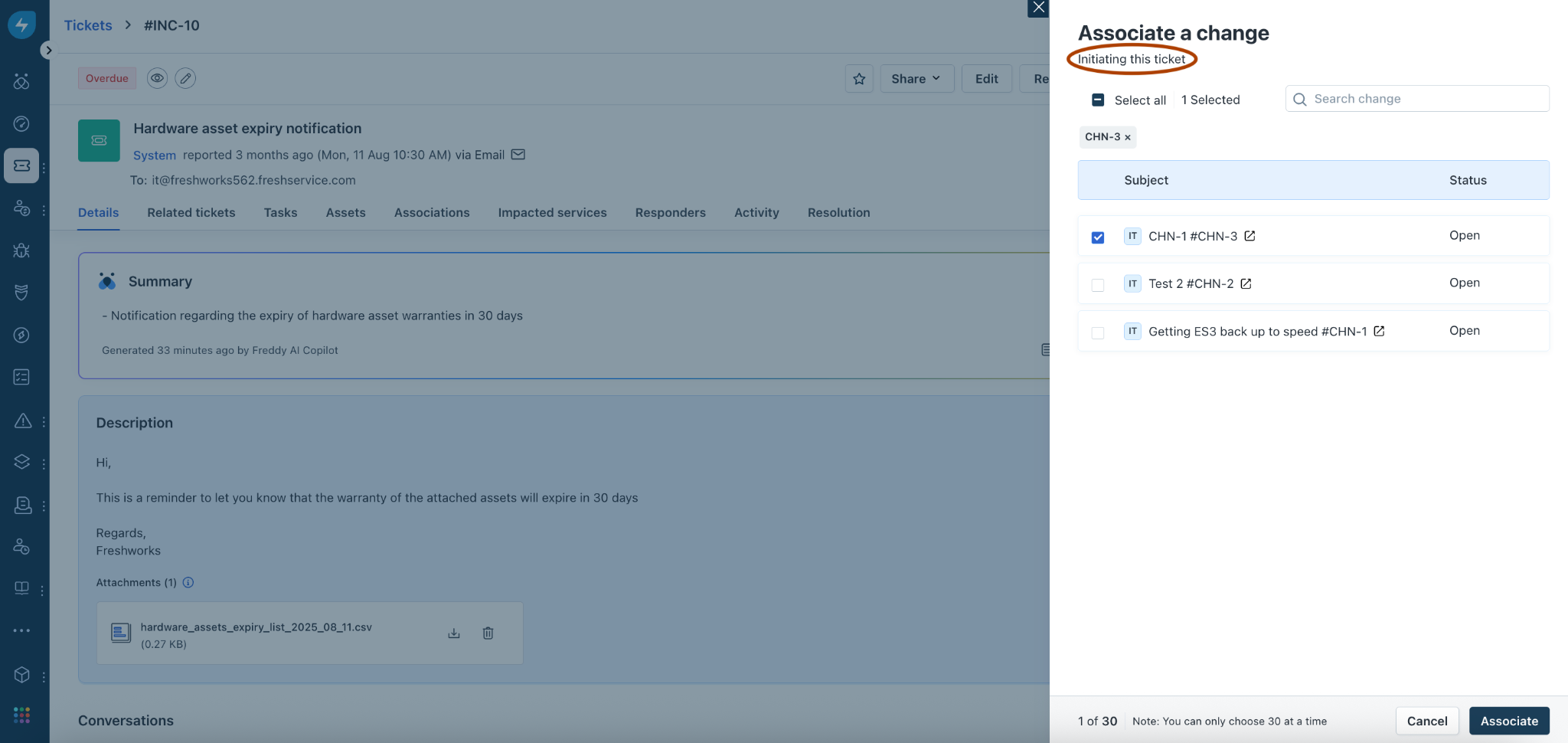 If you select Change initiating this ticket, the Associate a change section opens on the right pane.