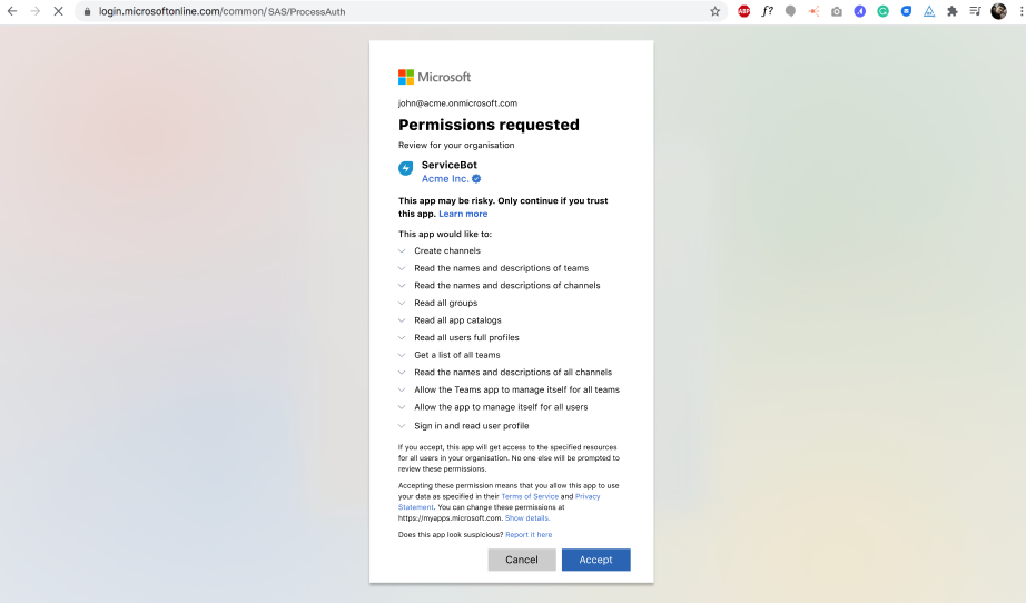 - Click Accept to authorise permissions by using your Microsoft admin account credentials.