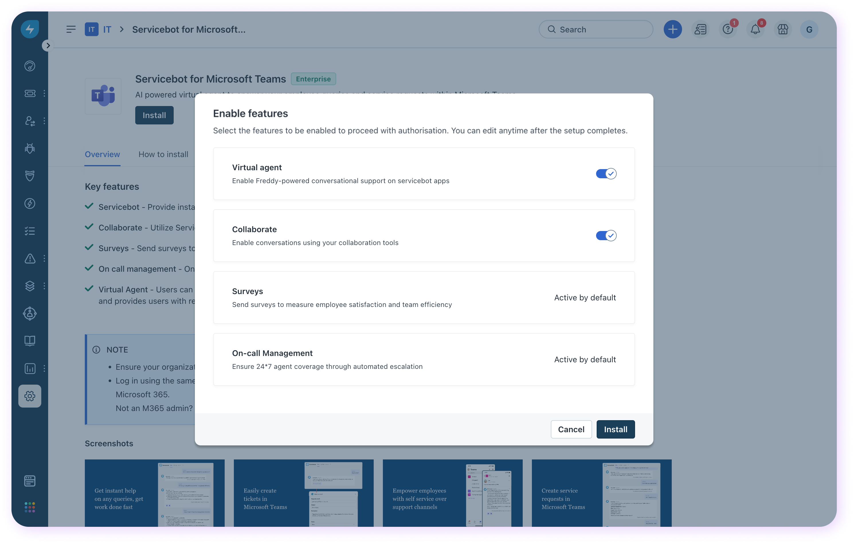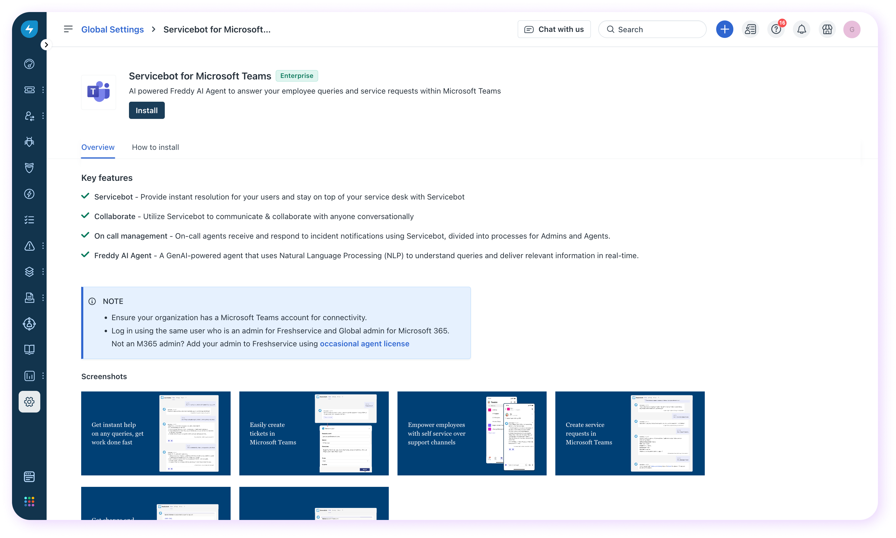 - For Enterprise users: Freddy AI Agent currently offers a 1-to-1 mapping of MS Teams and Freshservice. Freddy AI Agent is limited to the workspace integrated with Freshservice. Multiple workspaces are currently not supported.
