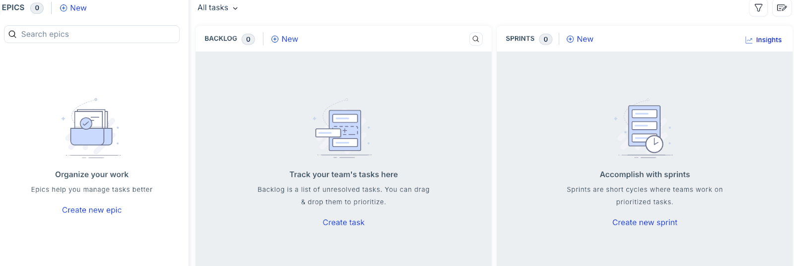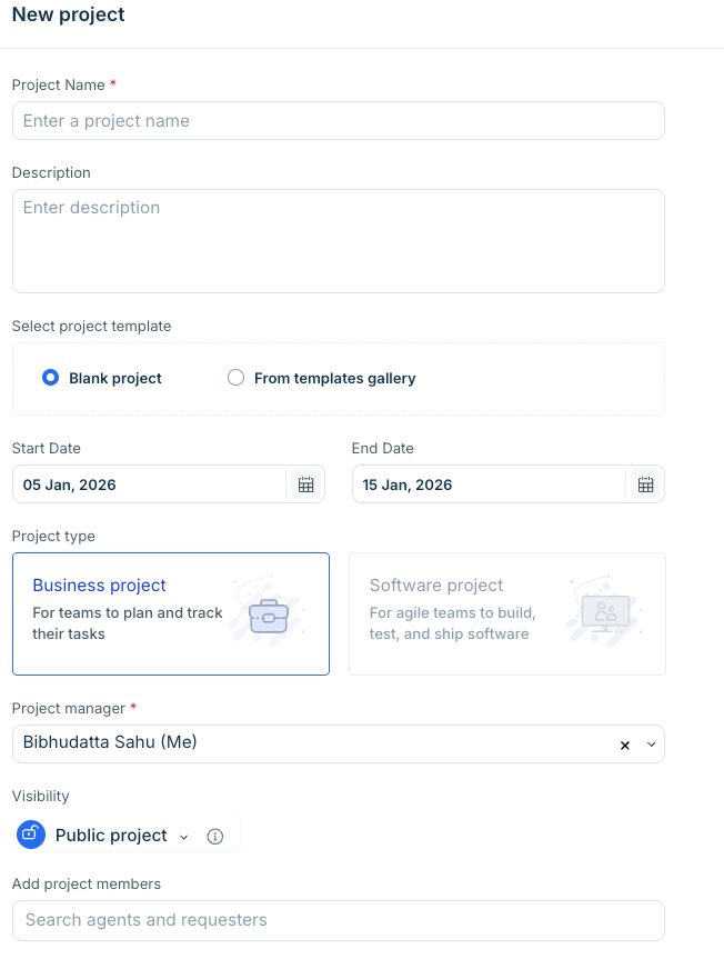 The selected project type determines the project layout and available features. For example, the Software project uses a Kanban-style view and includes options to create epics, sprints, and backlogs as shown in the following image.From Project manager list, select project manager who will manage the project.