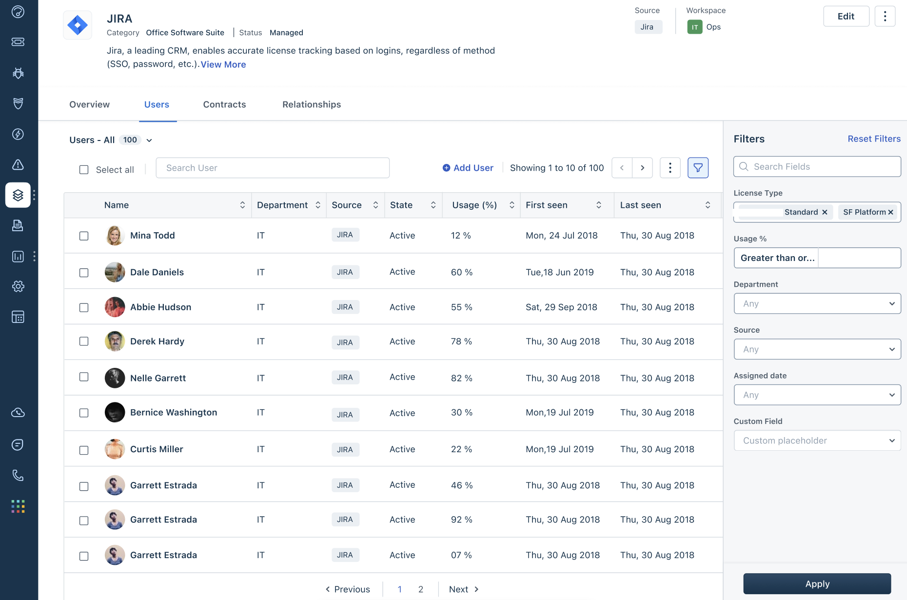 The Jira app in Freshservice allows you to discover user information, manage contracts and relationships, and provides you with an overview of usage activity, contracts utilization, and so on.