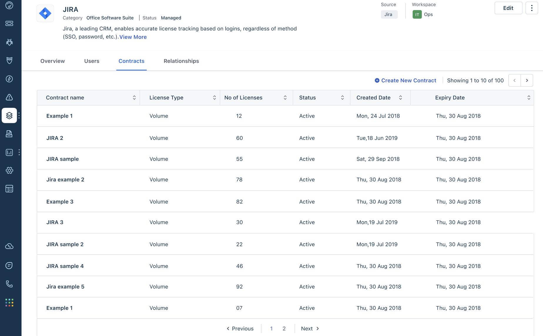 4. Click the Contracts tab to view all the contract information, such as name, license type, number of licenses, status, created date, and so on. You can also create or delete contracts.