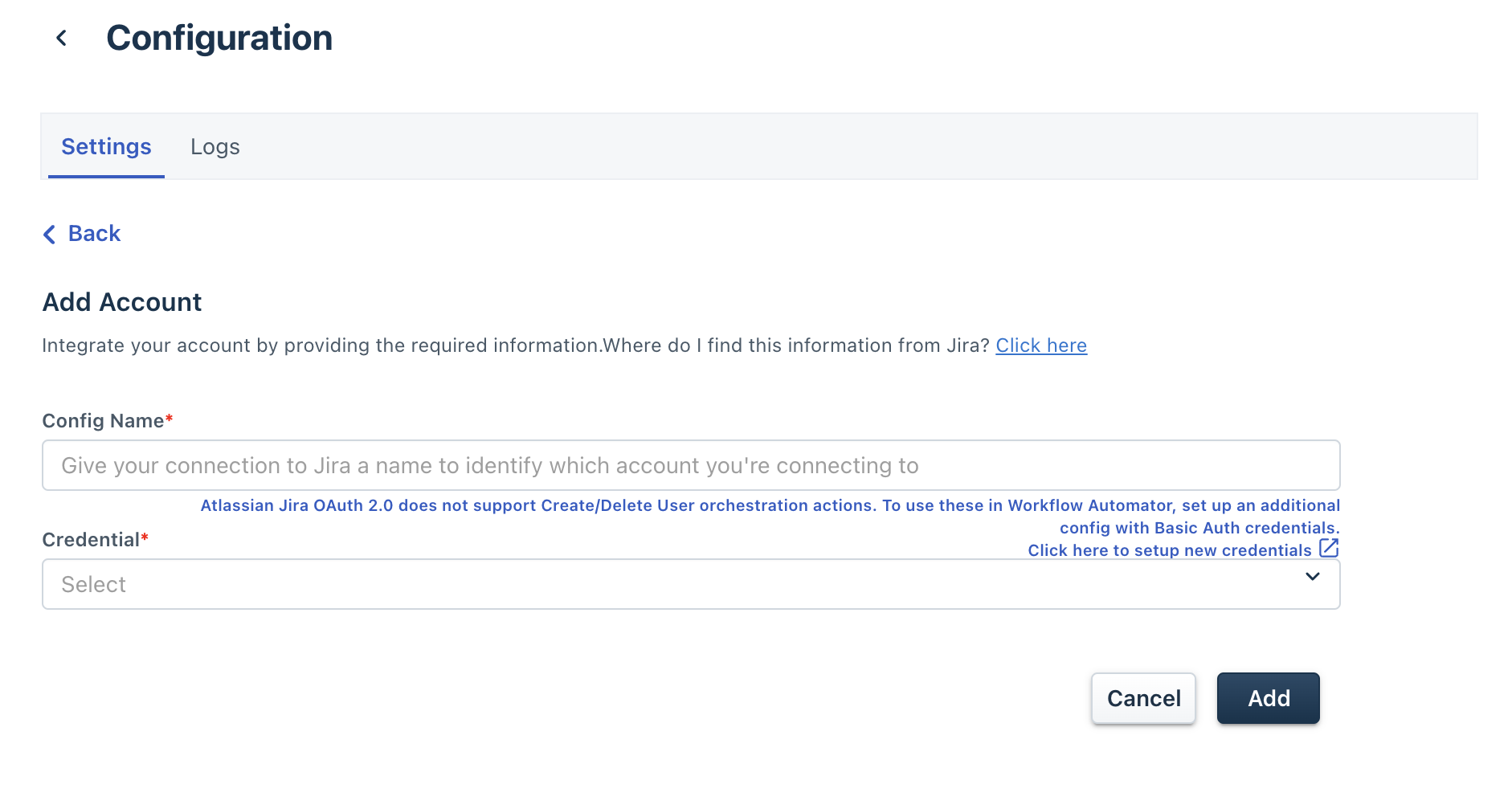 Note: OAuth 2.0 supports SaaS discovery as well as orchestration actions (except 'Create user' and 'Delete user' actions). If you want to create and delete users via workflows, you need to add an additional configuration using Inline Credentials. This is a limitation imposed by Atlassian Jira APIs.- See OAuth 2.0 (3LO) apps for information on how to configure OAuth 2.0 credentials.