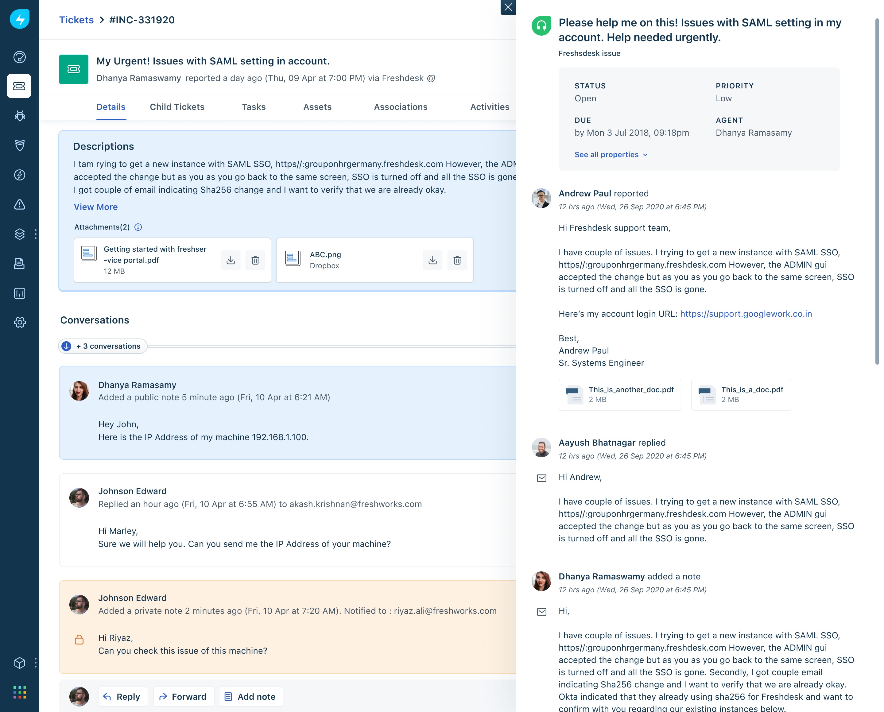Internal agents will view customer replies, status updates, and default properties of the actual Freshdesk ticket.
