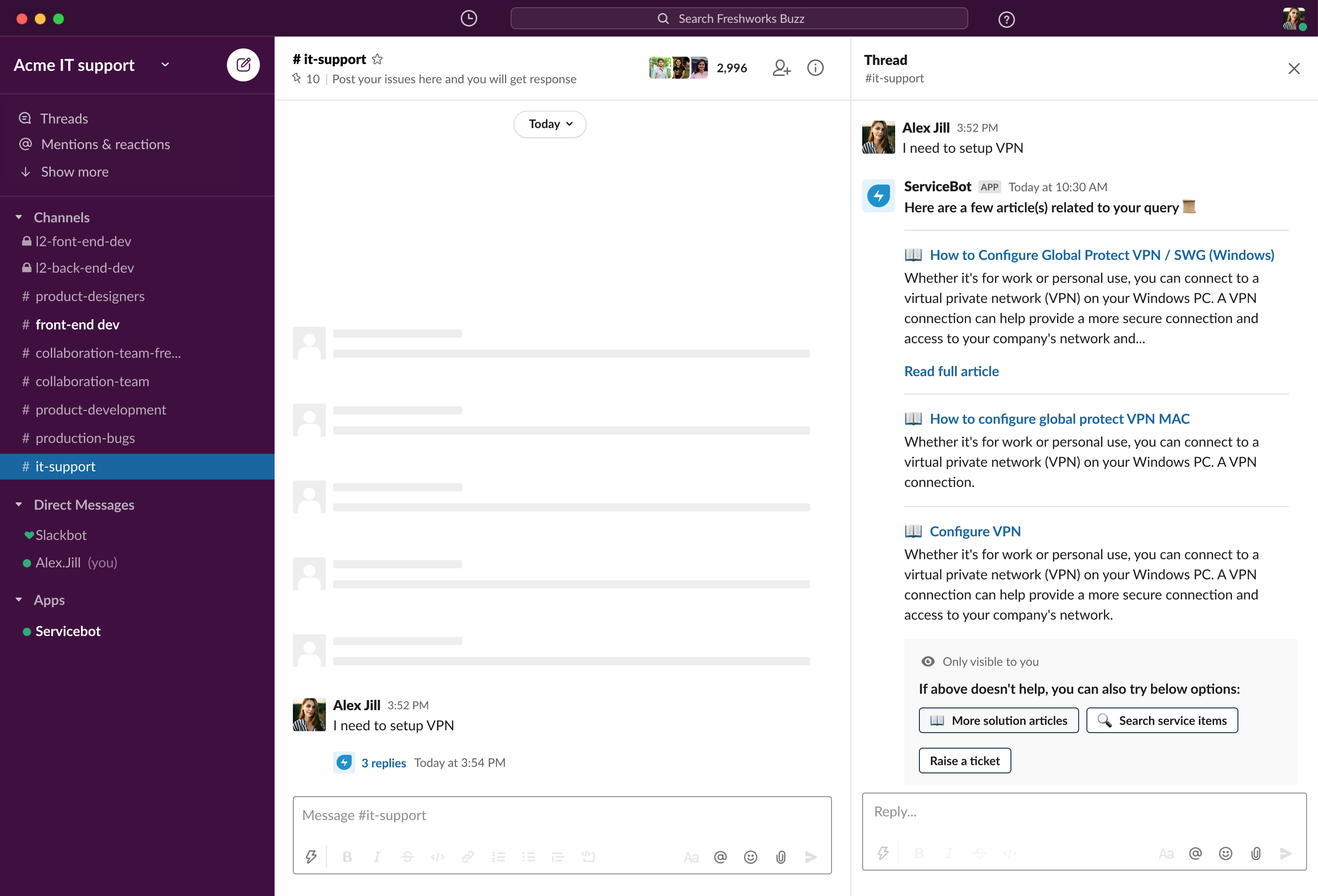 Ask a question to get answers from Freddy AI Agent. The '@' actions mentioned above are supported. When there is a relevant match in the Knowledge base or Service Catalog, Freddy responds accordingly. If the response to the query involves service items and solution articles that cannot be accessed by all members of the channel due to access controls, the Freddy AI Agent will redirect you to your DMs to reveal them.