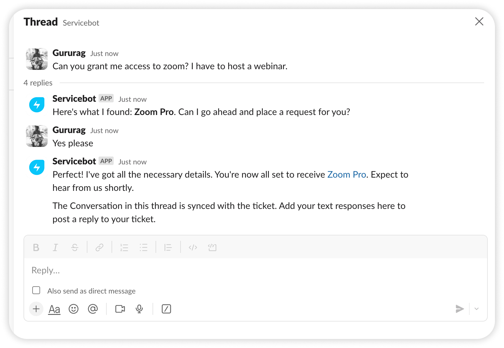Powered by generative AI, Freddy AI agent enables conversational experiences where requesters can be aided with step-by-step resolution through two-way dialogue. It also allows you to raise requests without the use of forms.