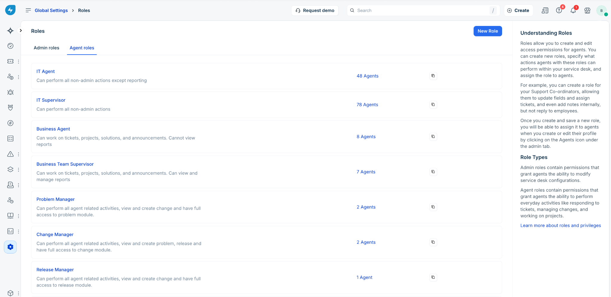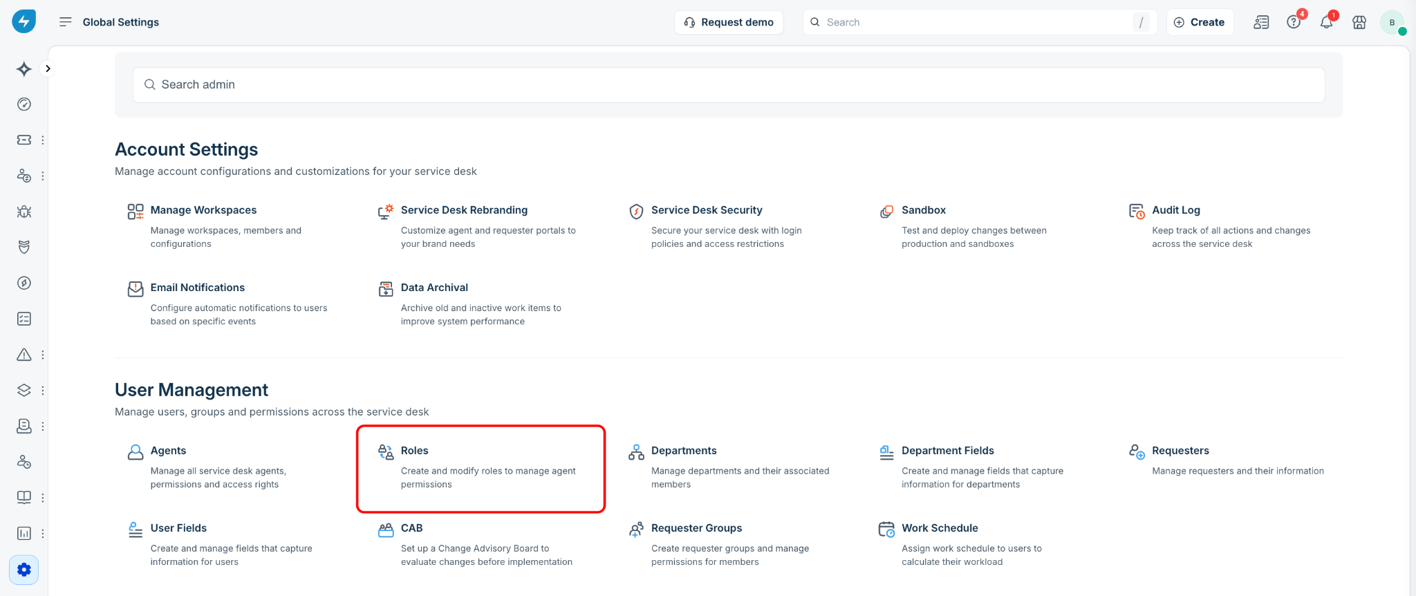 2. Select Admin roles or Agent roles, depending on the role category you want to update.