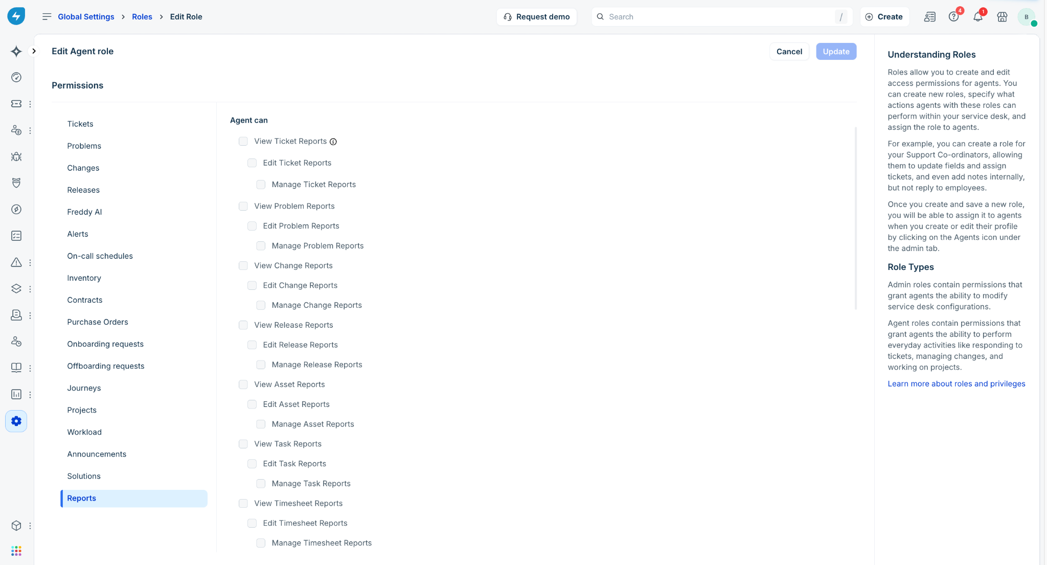 Ensure that you have Admin privileges to update role permissions. To provide access to reports, follow these steps:
