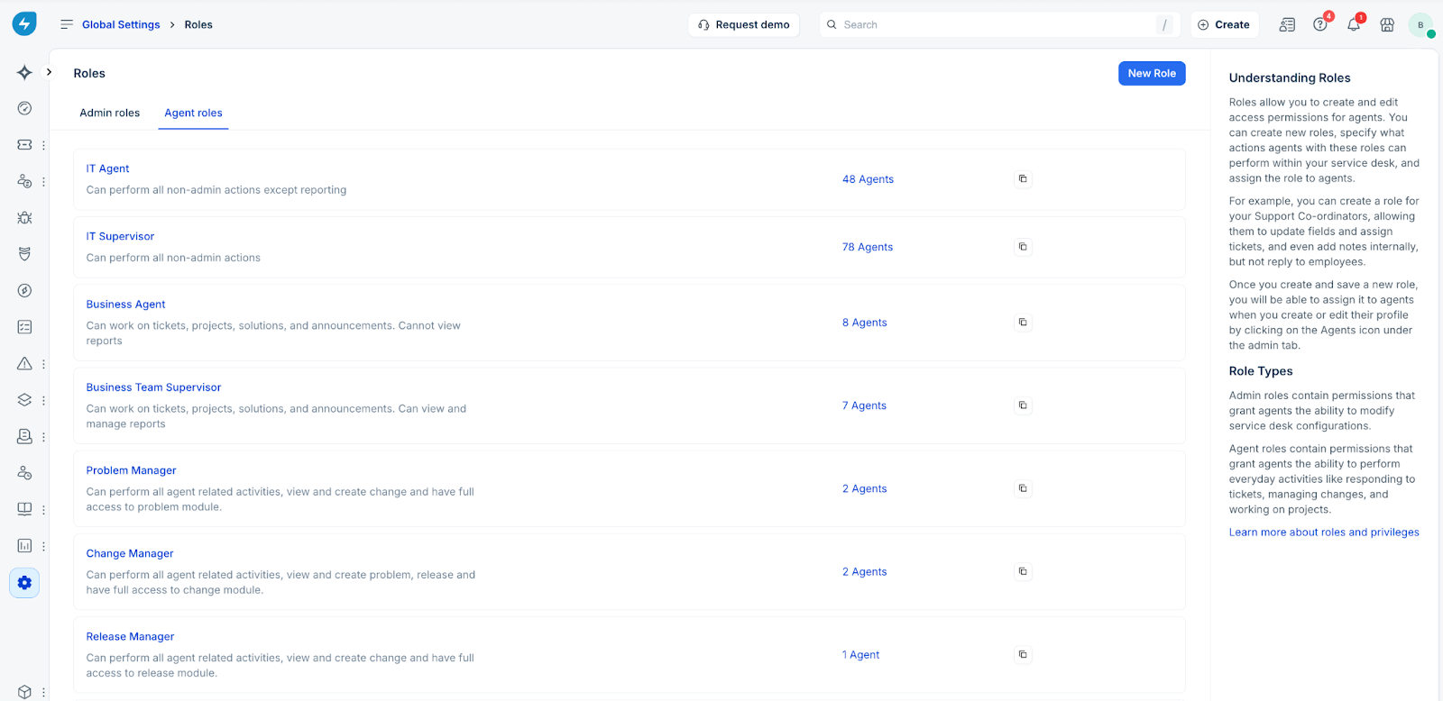 Choose Admin roles or Agent roles to view the list of specific roles in that category.
