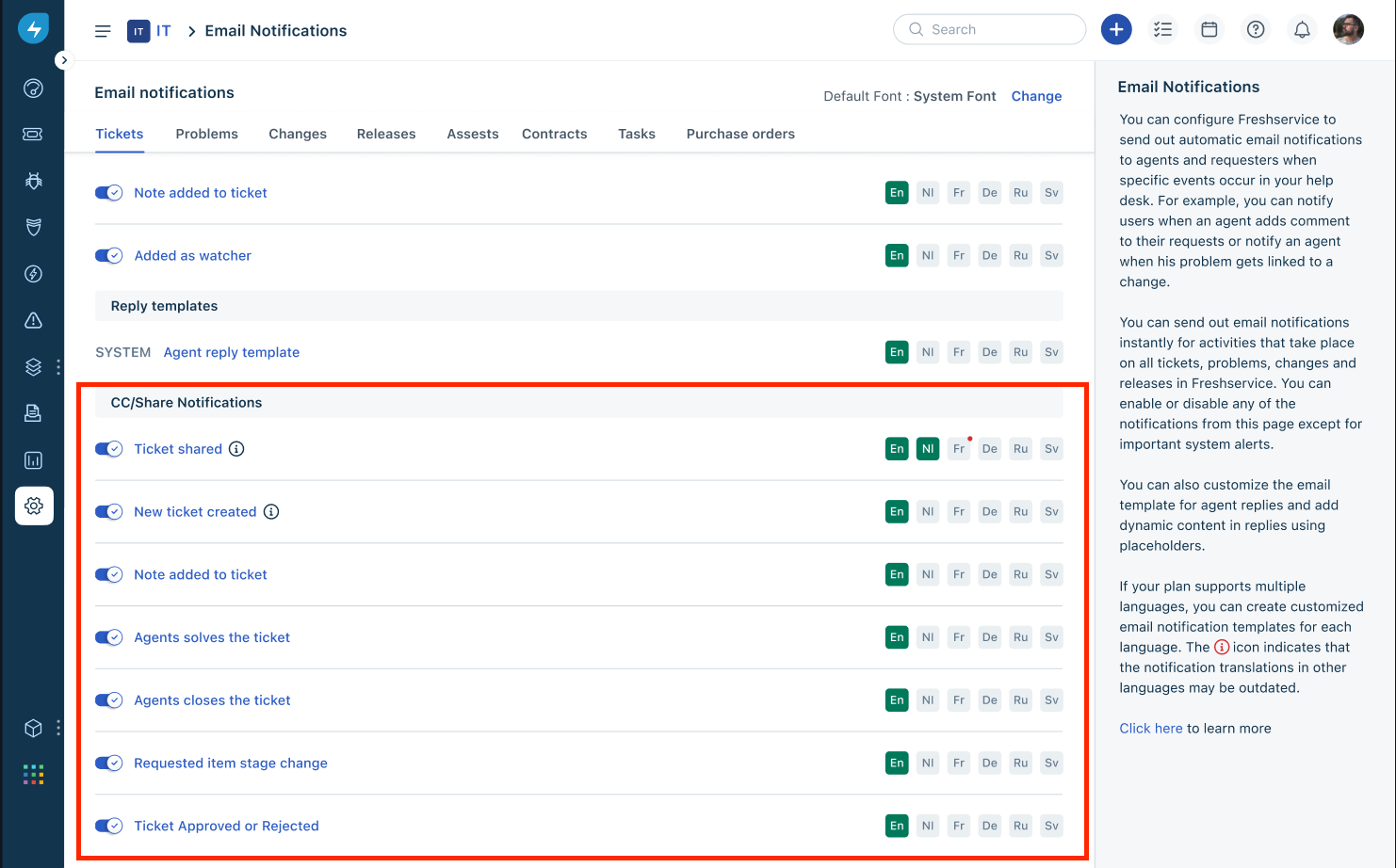 Configure the email notification settings for ticket sharing under CC/Share Notifications.