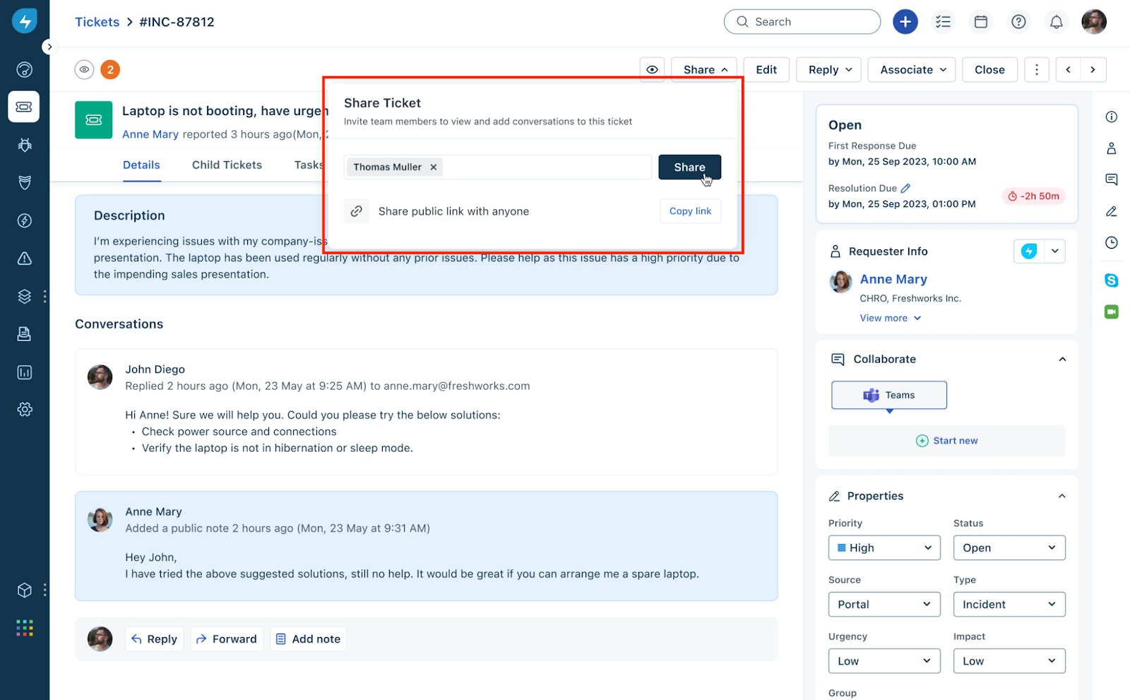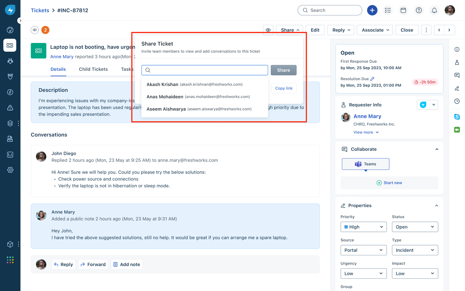 Search and add users (agents or requesters) with whom you want to share the ticket. Or, you can copy the public link and share it with relevant users.