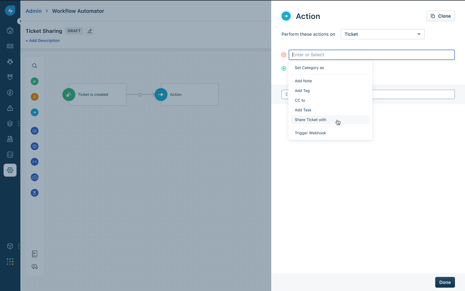 To automate ticket sharing through Workflow Automator, select Share ticket with as an action.