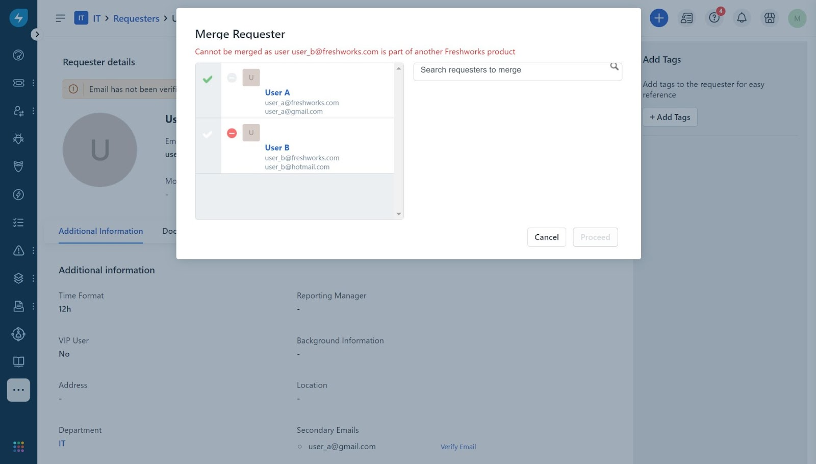 Expected Behavior: The merge action will not be allowed because if merging is allowed, User B will get deactivated in Freshservice_Instance_2, thus causing them to lose access to that Freshservice account. The below error is seen.