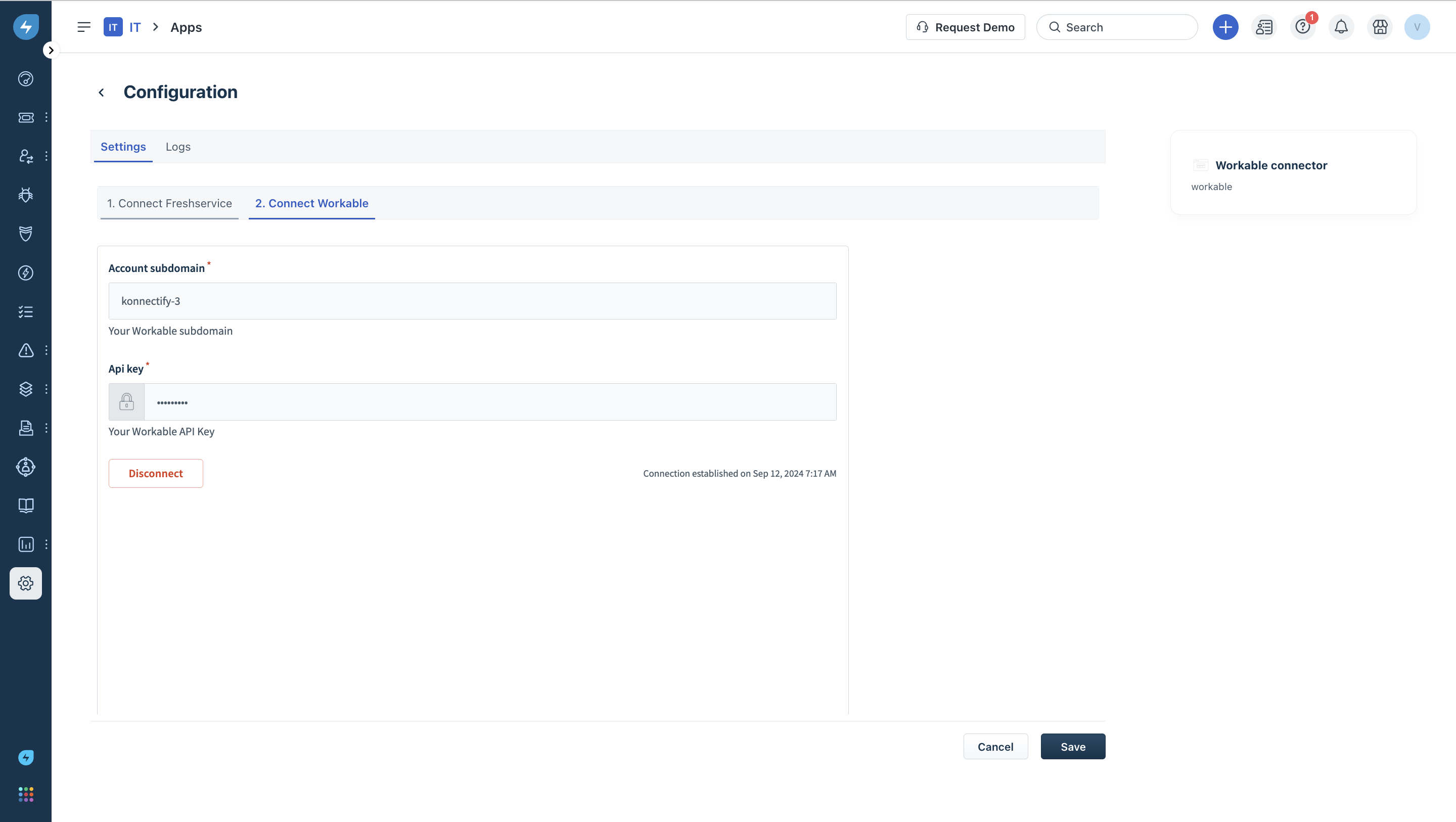 b. Settings: Use this option to return to your configuration page and disconnect or re-authenticate Workable or Freshservice.