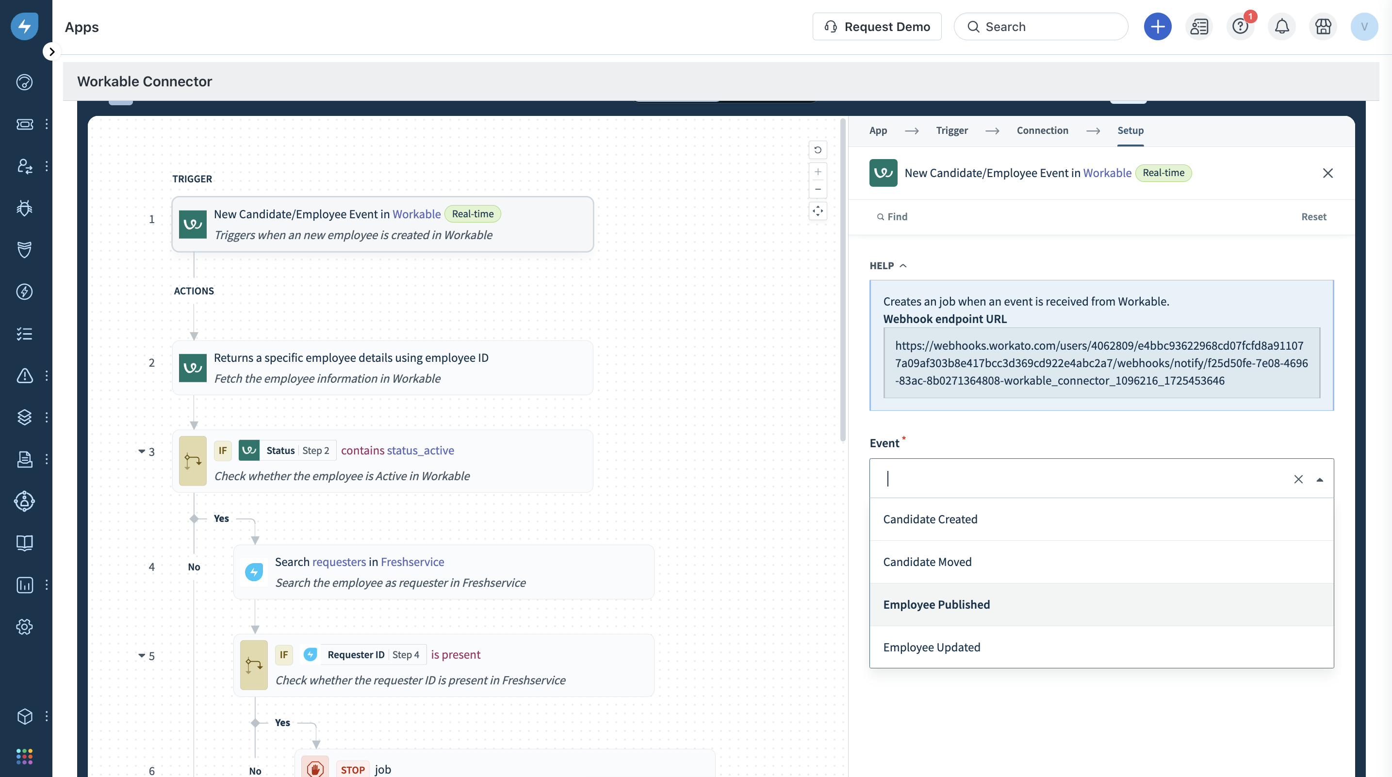 Trigger - The trigger acts as the starting point for any recipe. For this recipe, the trigger is a new employee hired on Workable. You can customize the trigger in the ways mentioned below.