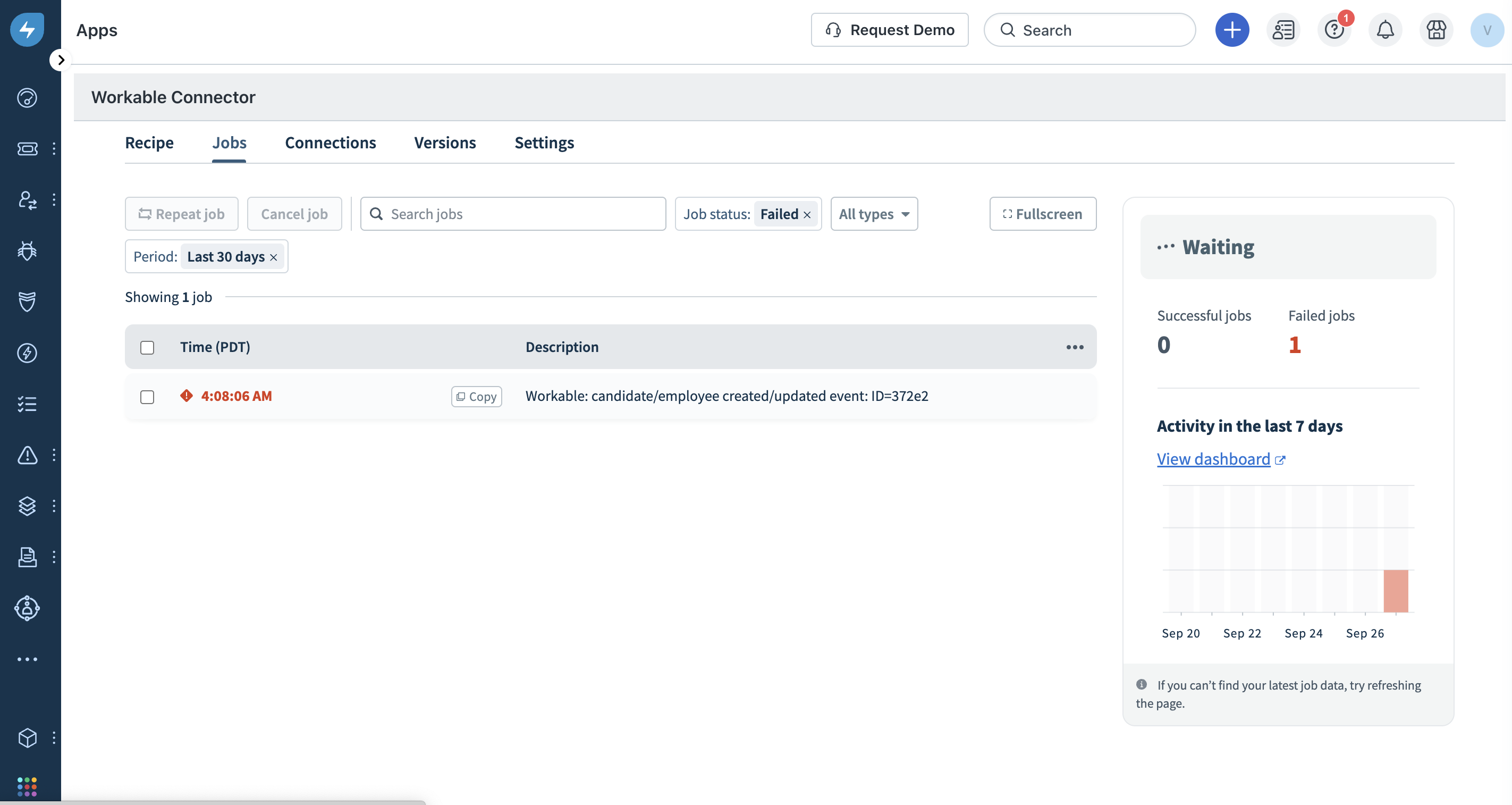 - You can filter to check just the failed jobs by using the Status filter on the top panel