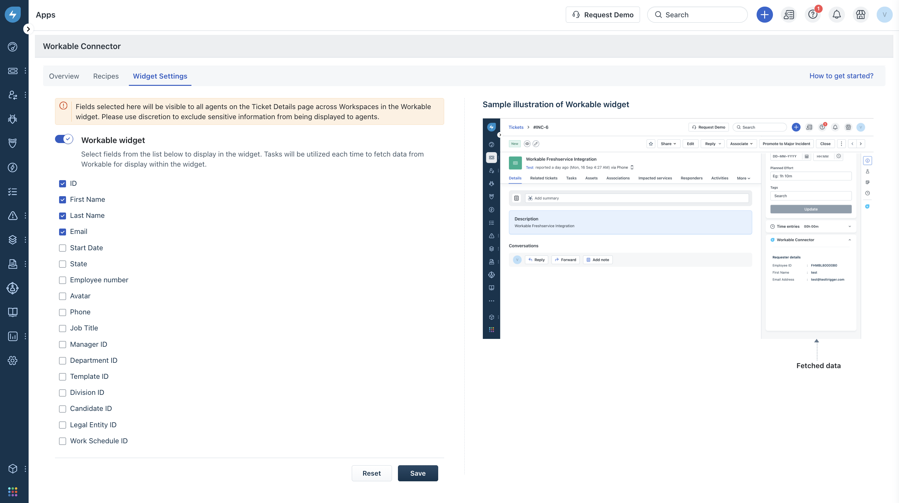 5. Once the data between Workable and Freshservice starts syncing up, you can choose to display a select set of these user fields for your Freshservice agents to quickly access in the format of a widget.