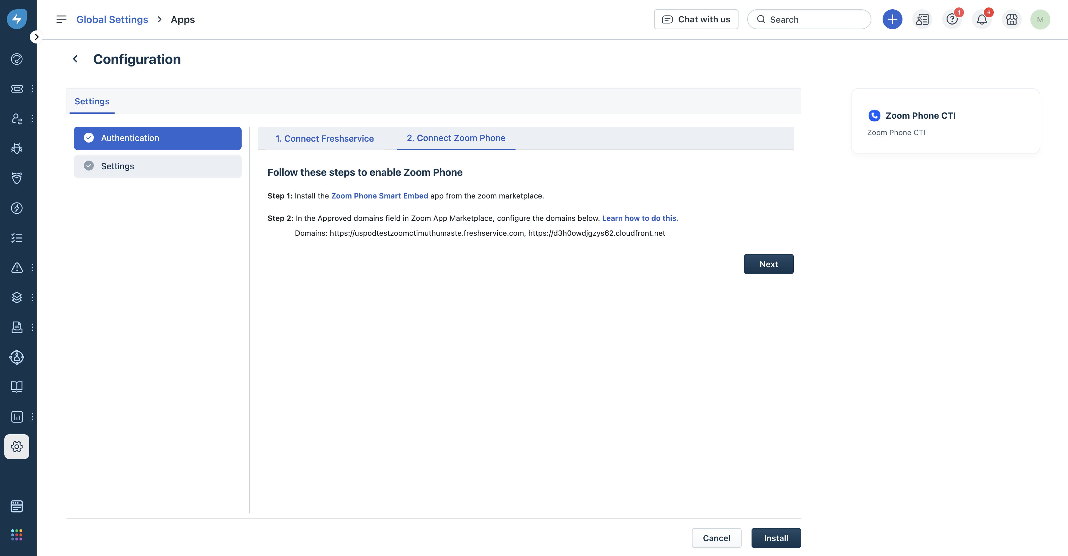 - In the approved domain list on the Zoom marketplace, you have configured the following Freshservice account domain: https://d3h0owdjgzys62.cloudfront.net.