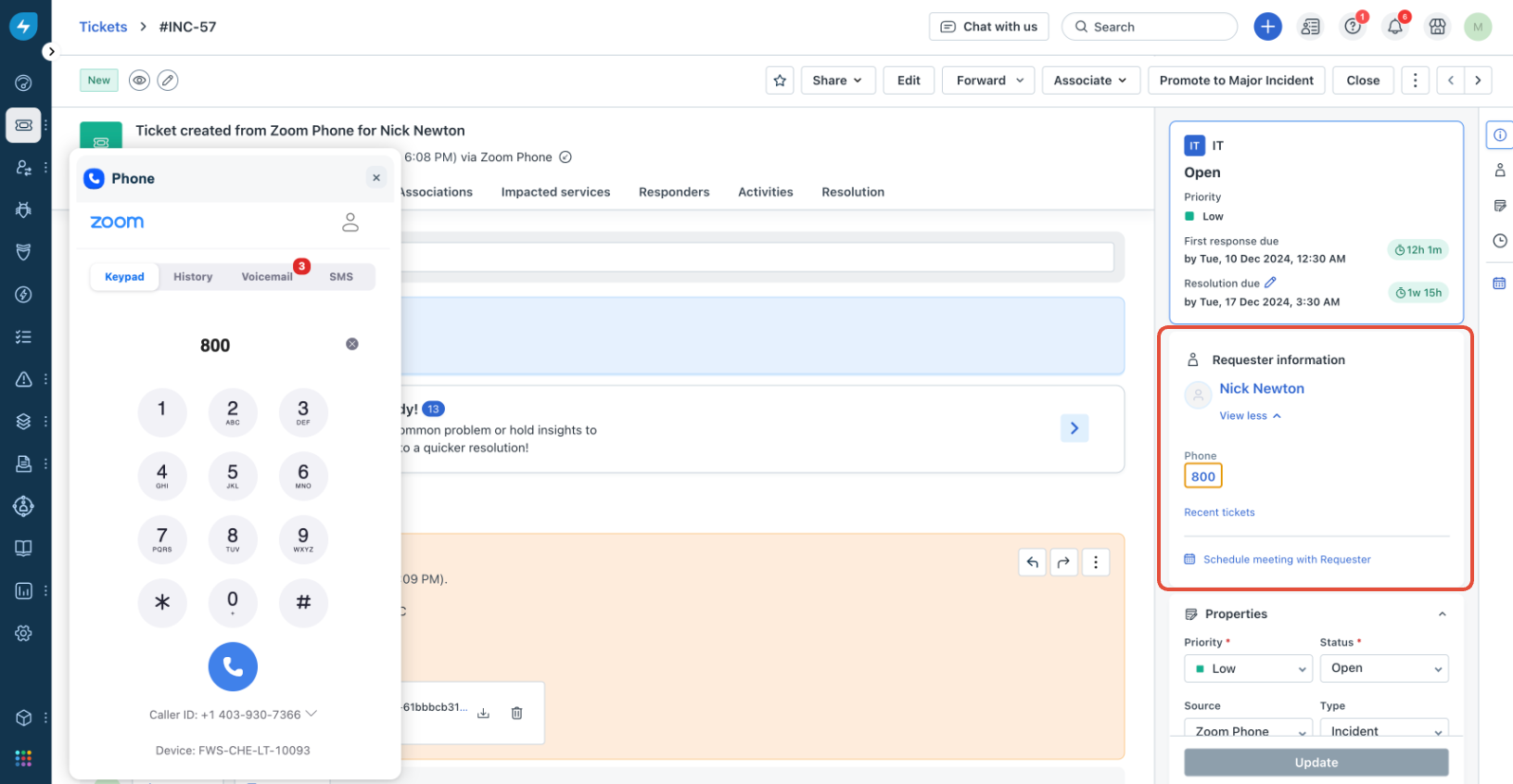4. Additionally, you can dial the number under Requester information in the ticket details to initiate the call.