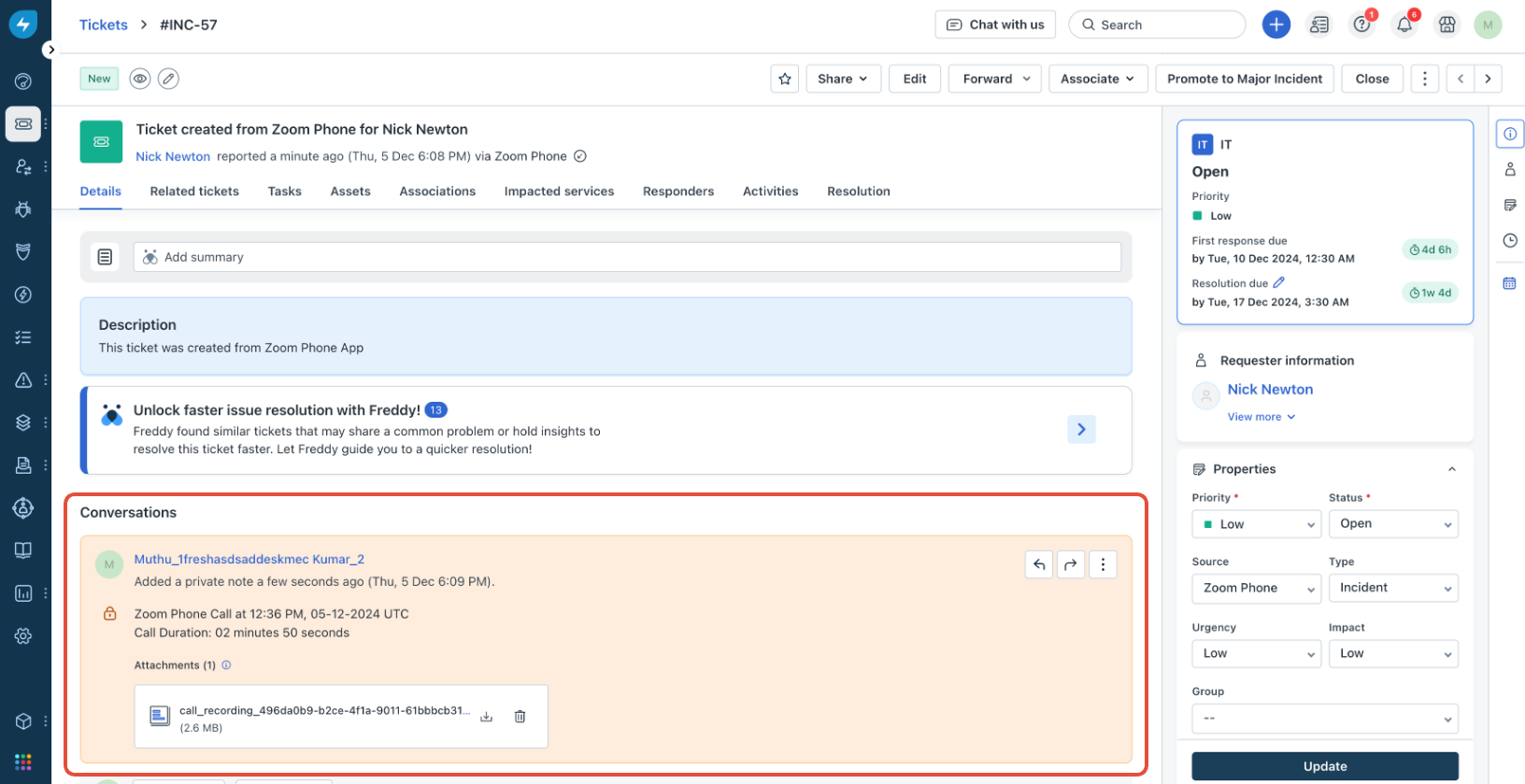 Whenever a new ticket is created or an existing ticket is updated after a call, a conversation summary gets added to the ticket. The conversation summary includes details, such as the call time, duration, agent's name, and recording.