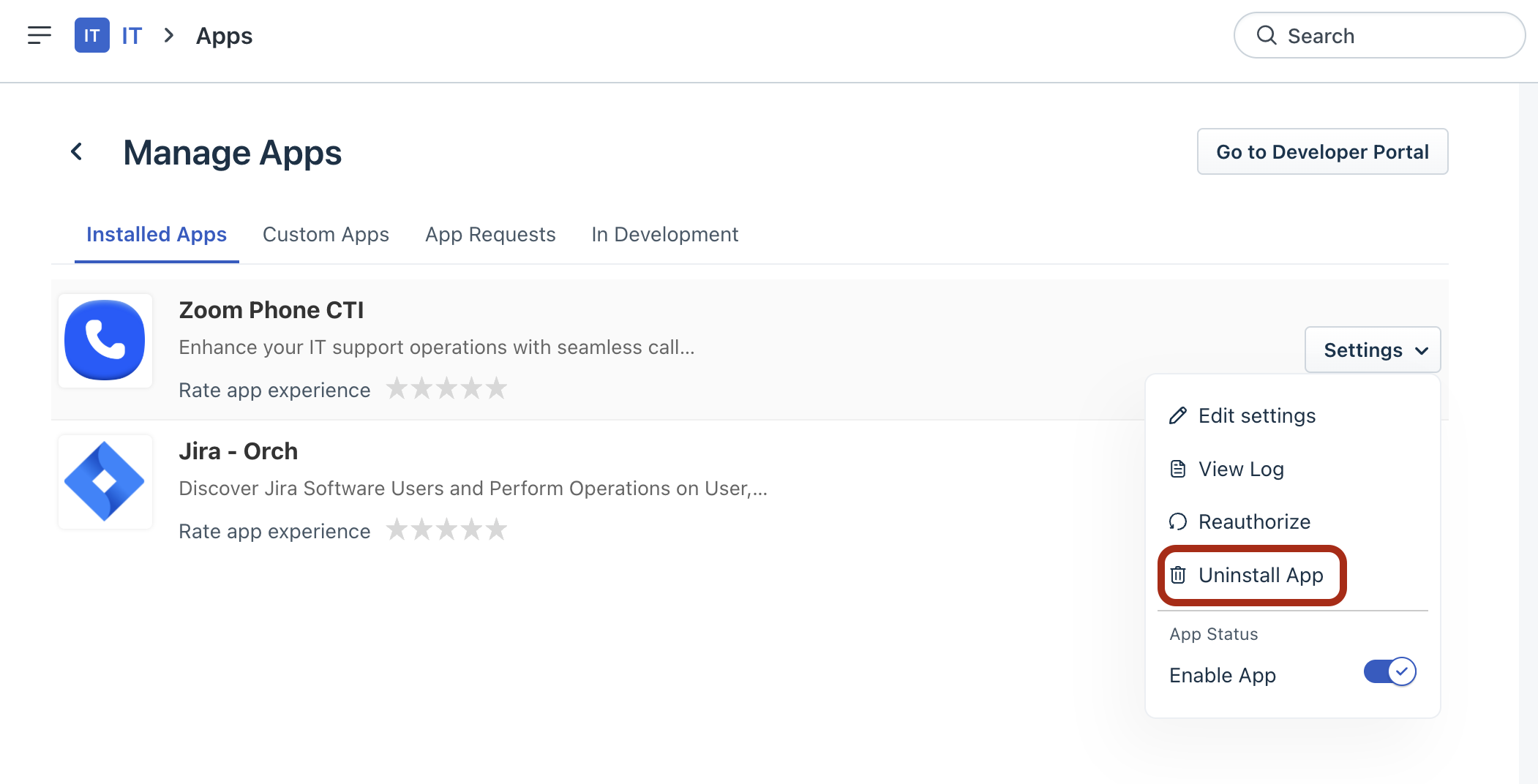3. Select Uninstall App from the Settings drop-down next to Zoom Phone CTI.