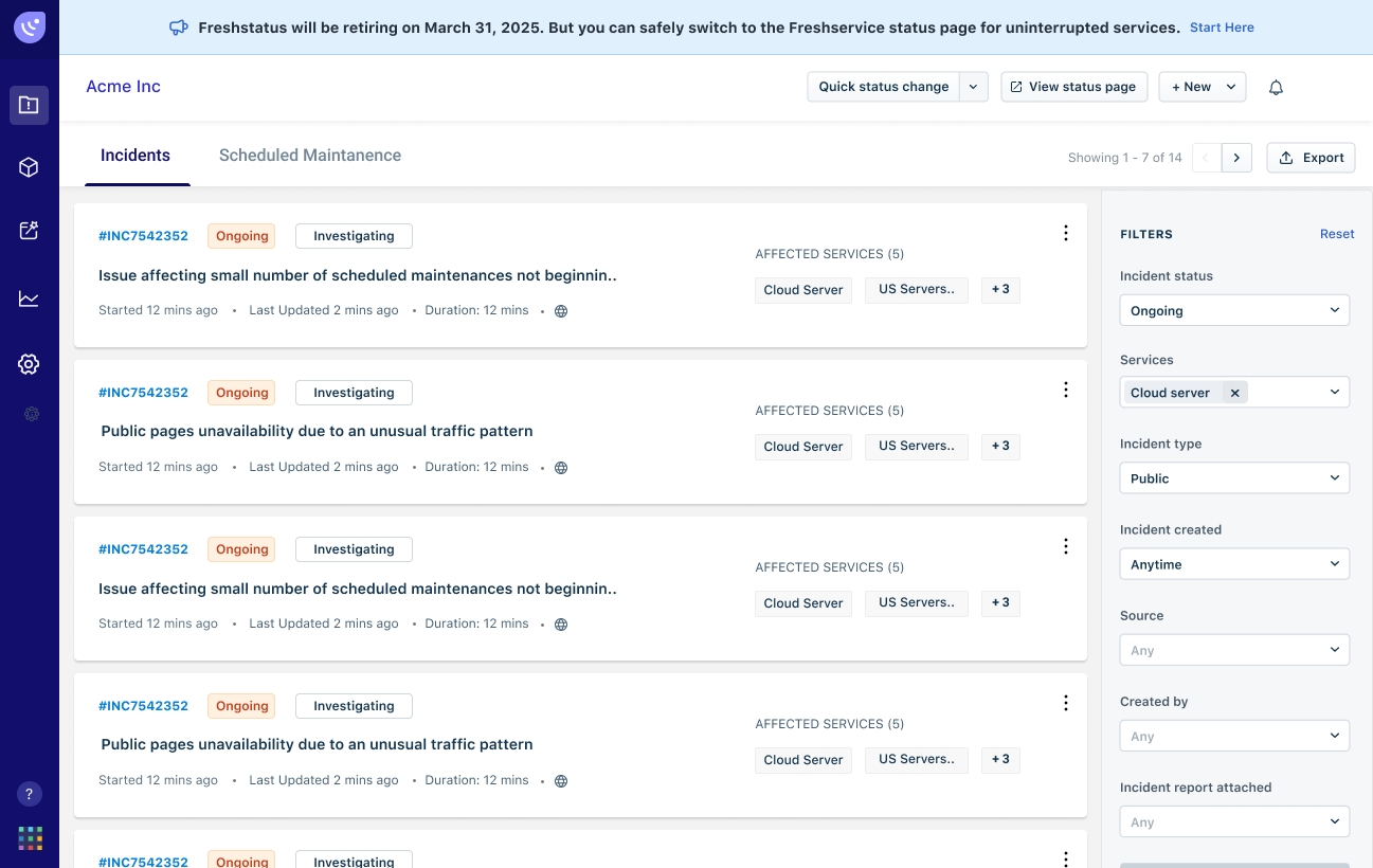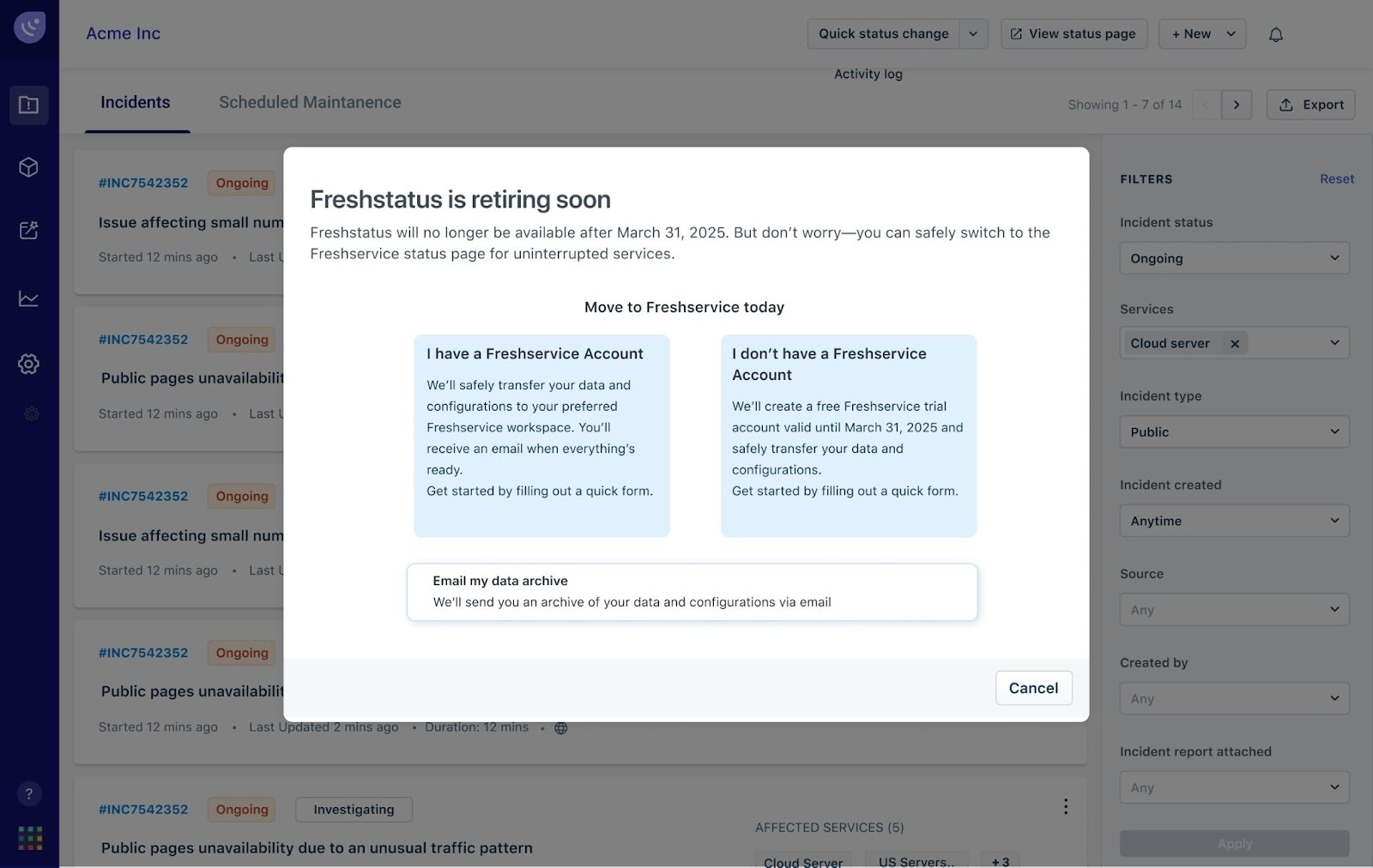 Freshstatus will be discontinued on March , 2026. To continue publishing incident and service updates without interruption, you can migrate your existing status page to Freshservice. This article explains the following: