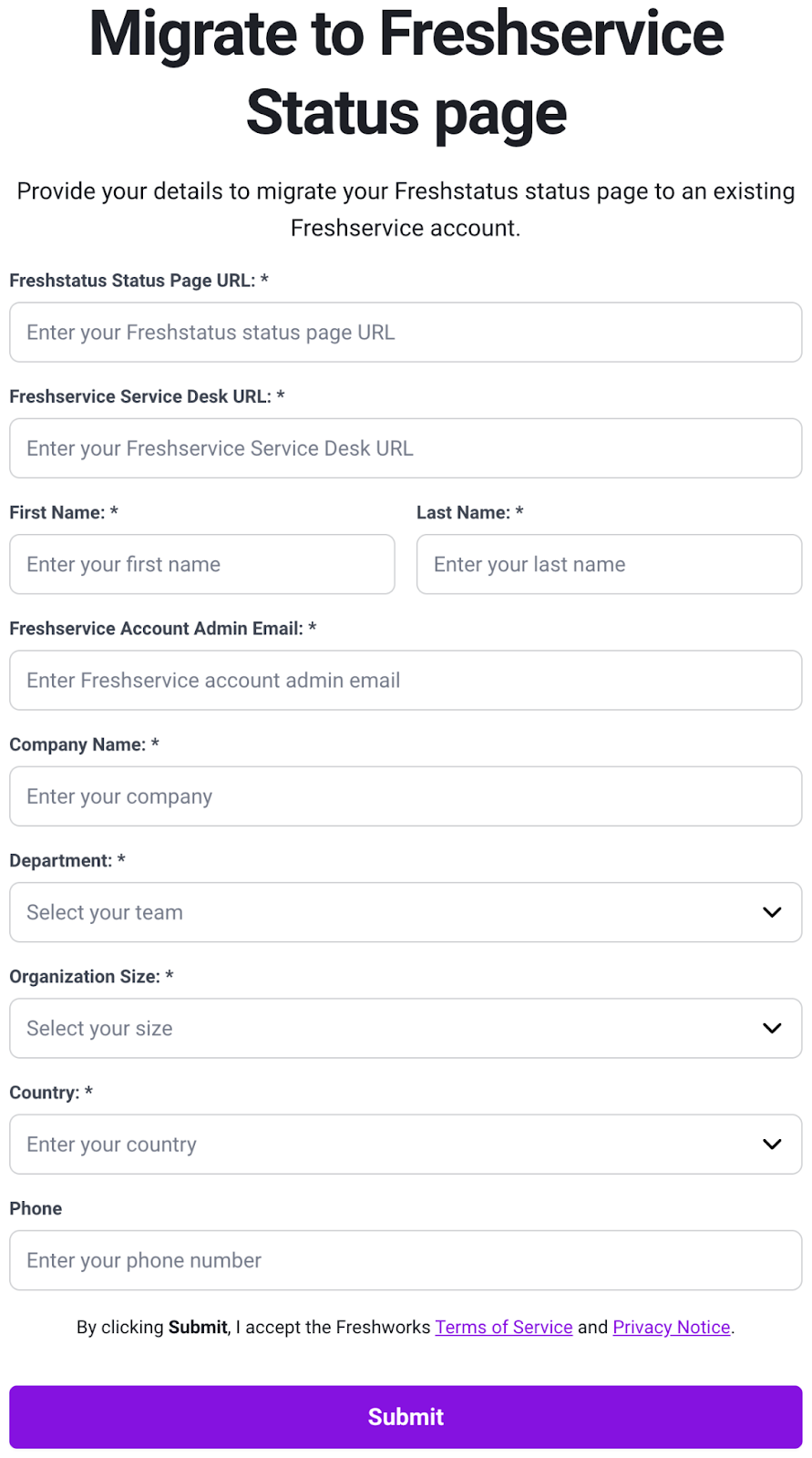 Note: The status page feature is included with the Freshservice Pro and Enterprise plans only. If you are a Freshservice Pro or Enterprise user, your data will be migrated upon submission of the form. If you are not currently on one of these plans, please upgrade to the Pro or Enterprise plan to access this feature.