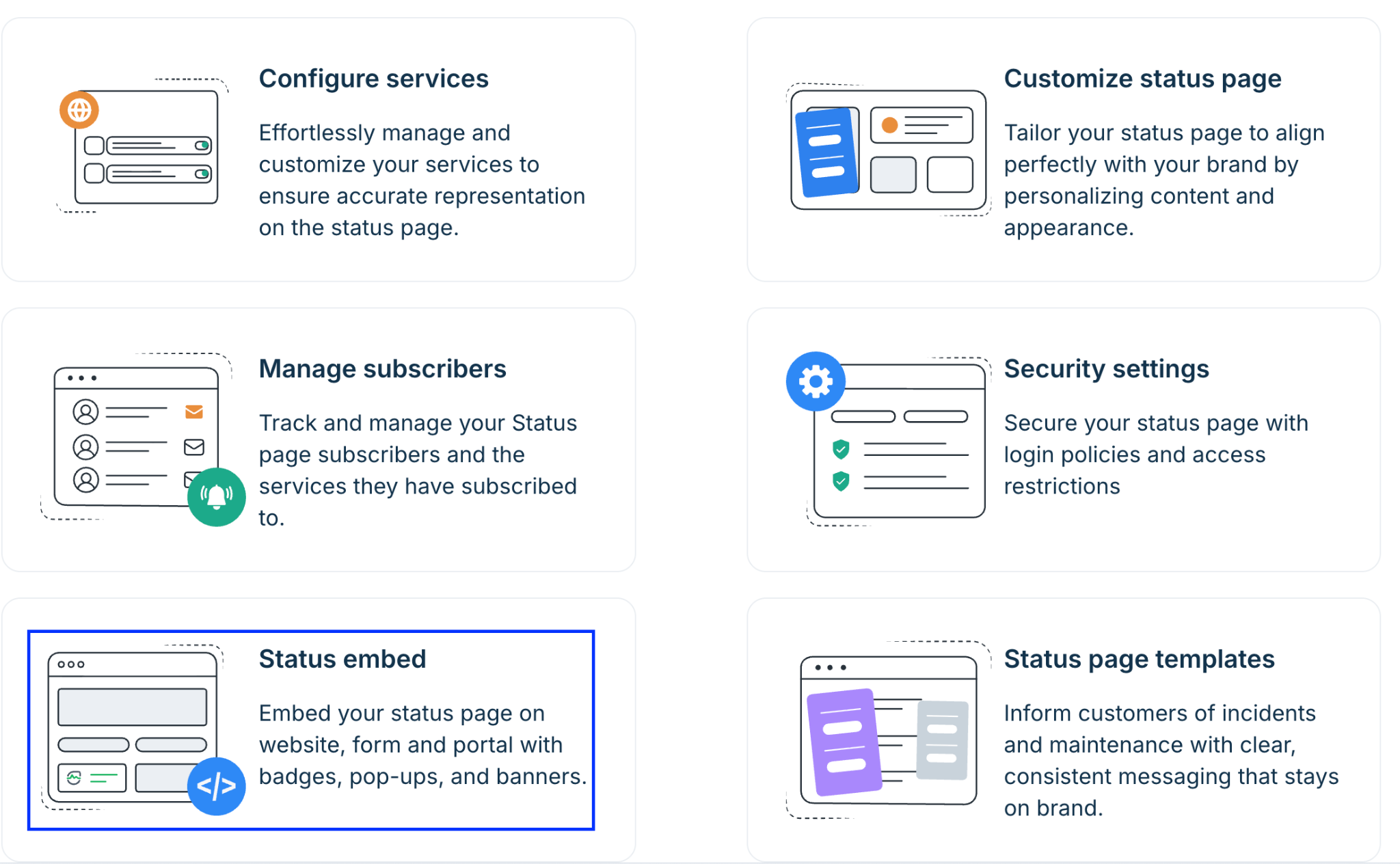 After you complete these steps, your Freshservice status page is available on the configured domain with updated notifications and embeds.
