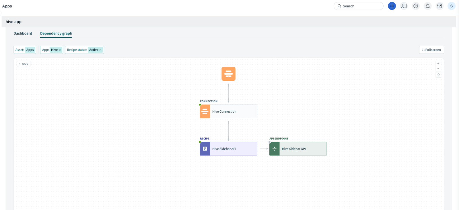 Click the Hive Connector App icon to view all dependencies, such as Connection, Recipe, API Endpoint, and so on.