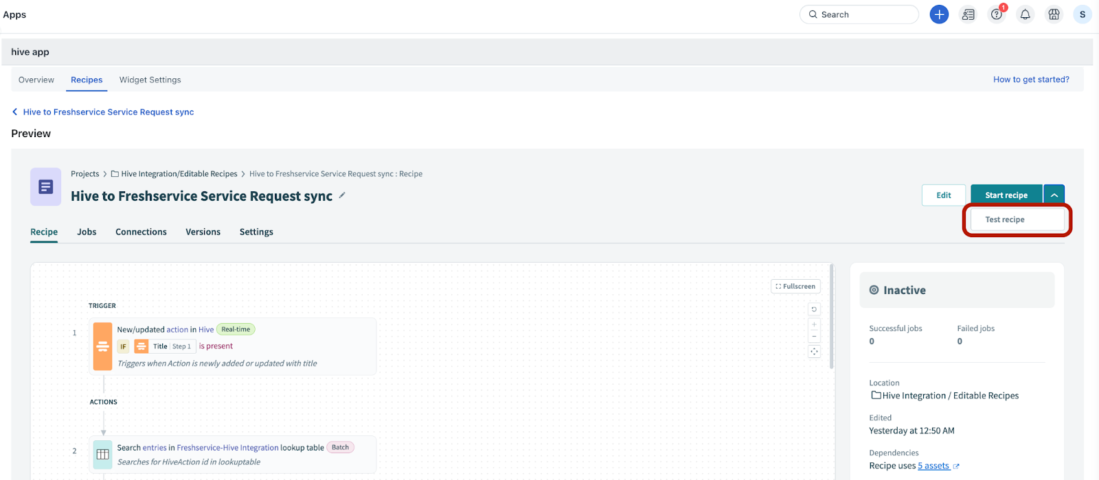 The recipe performs a specific set of actions based on the conditions met. For example, the recipe creates or updates a service request in Freshservice for a new or existing task in Hive.