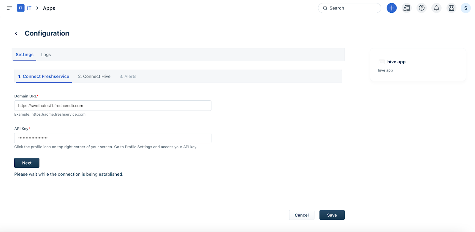 Ensure that your Freshservice API Key is enabled before initiating the installation. Click Next.