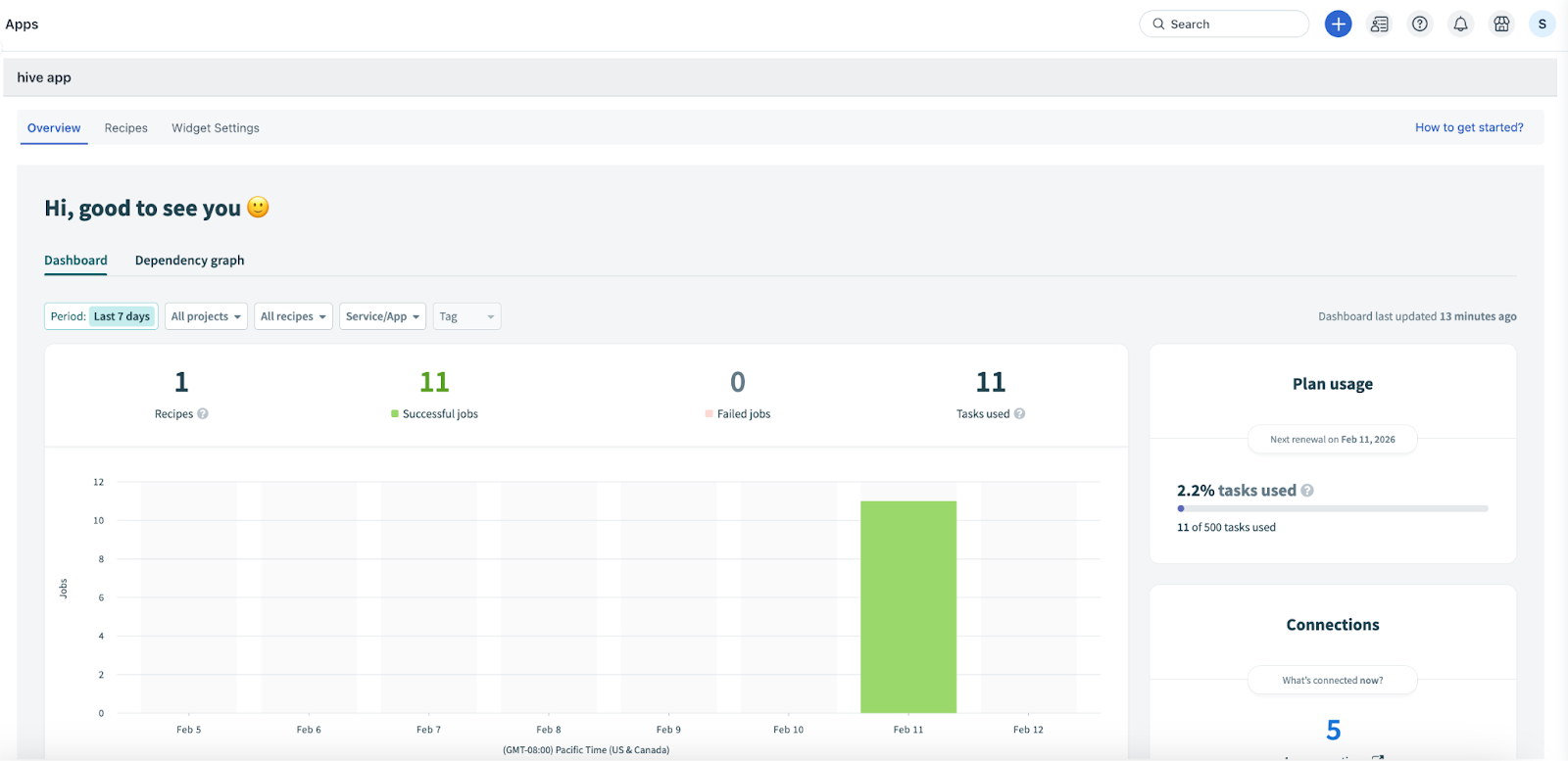 Note: Use the Period, Project, All recipes, Service/App, and Tag filters to modify the graph view. You can also sort and view the required data in a tabular format (below the graph), and view your plan usage and connection details on the Dashboard tab.