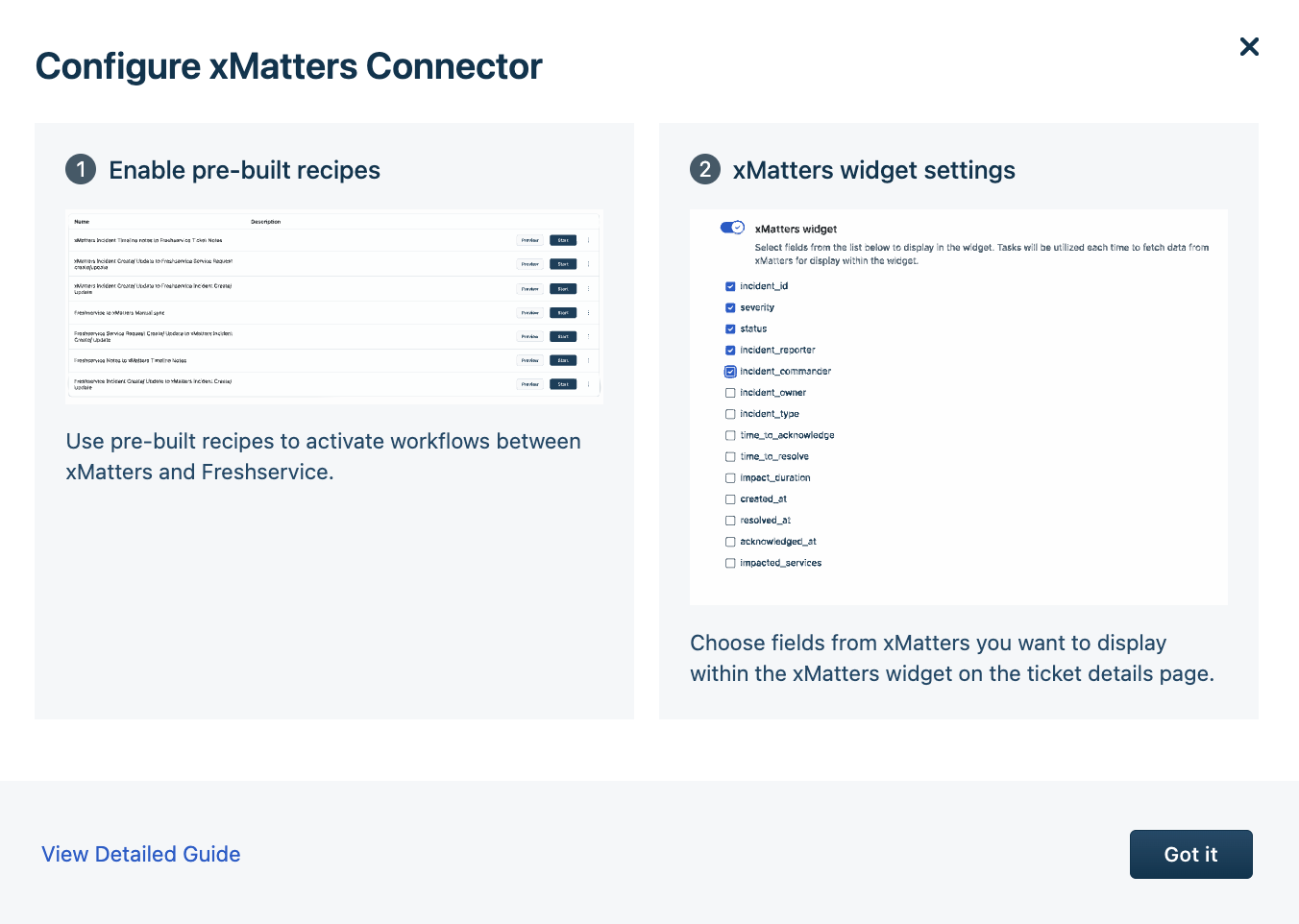 The following default recipes are available with the Freshservice and xMatters Connector integration.