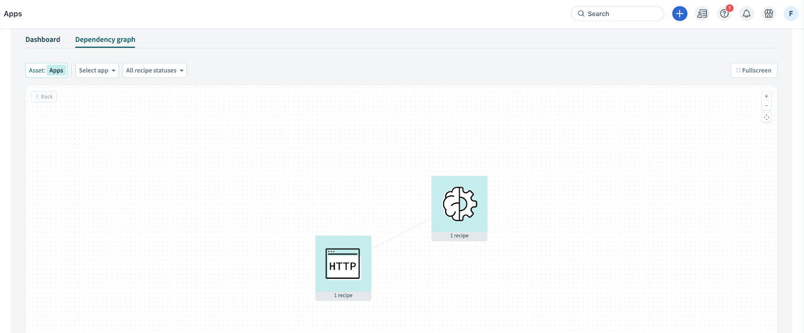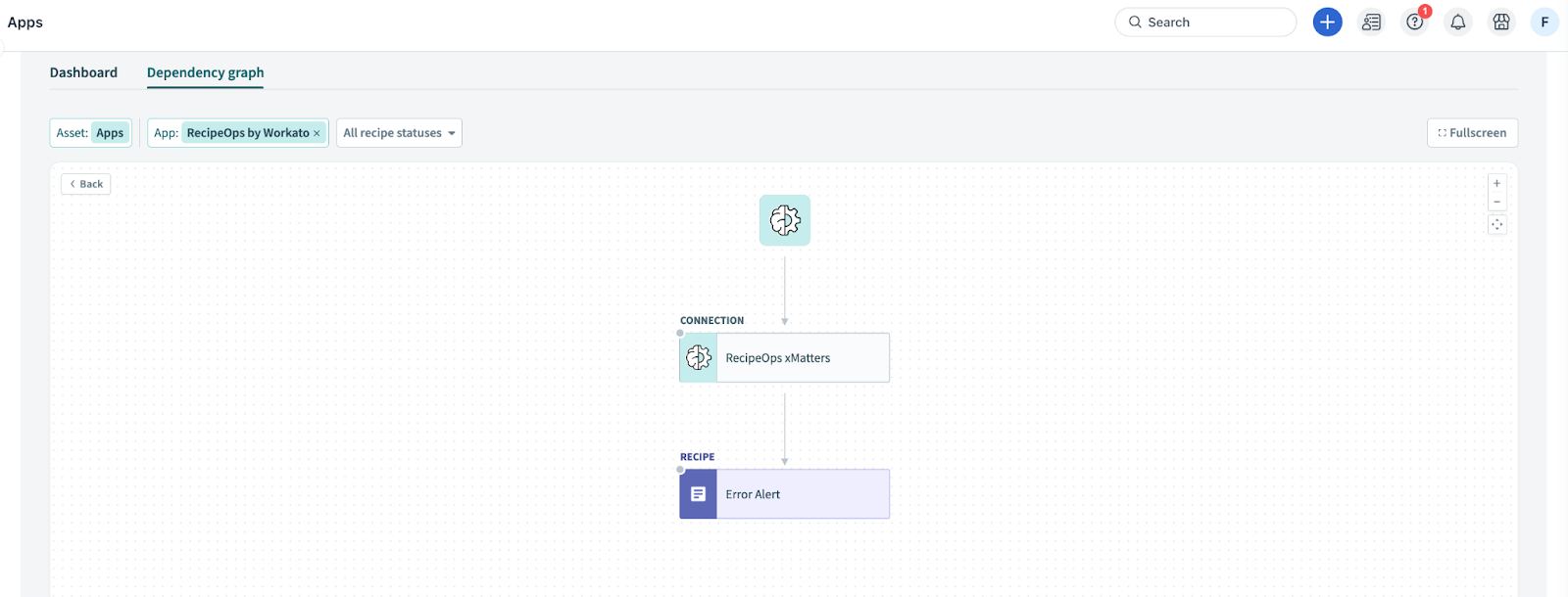 Click on any icon to view all dependencies, such as Connection, Recipe, API Endpoint, and so on.