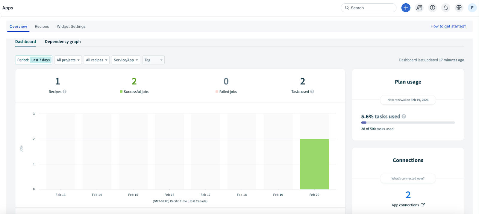 Note: Use the Period, Project, All recipes, Service/App, and Tag filters to modify the graph view. You can also sort and view the required data in a tabular format (below the graph), and view your plan usage and connection details on the Dashboard tab.