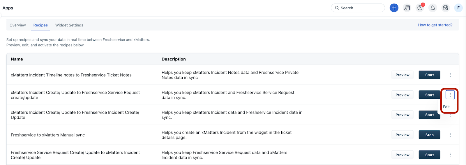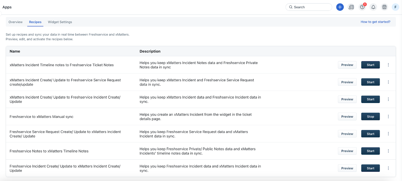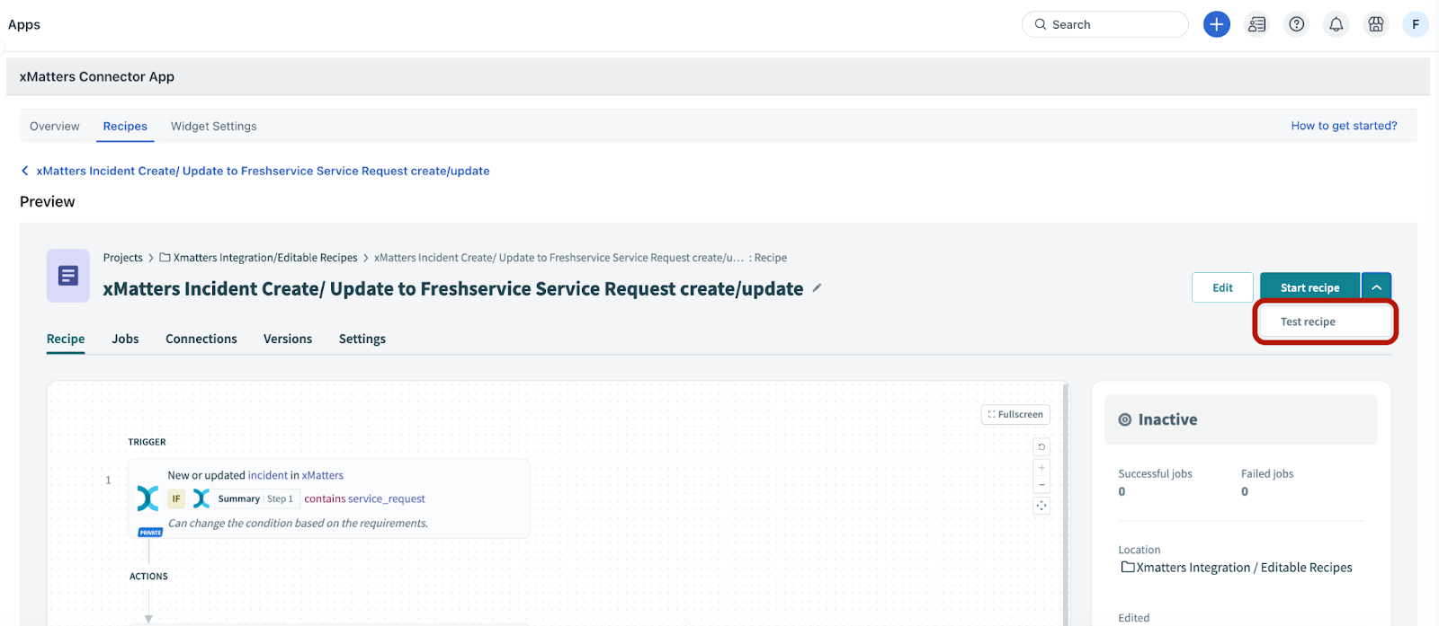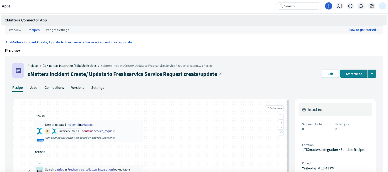 The recipe performs a specific set of actions based on the conditions met. For example, the recipe creates or updates a service request in Freshservice for a new or existing incident in xMatters.