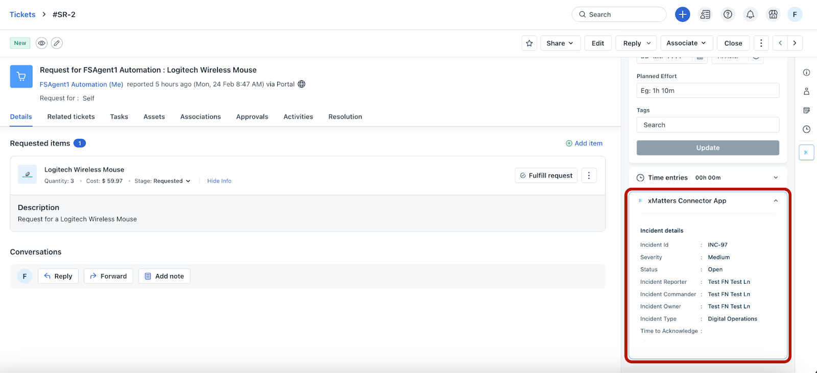 Default recipe: xMatters Incident (create/update) to Freshservice Service Request (create/update)