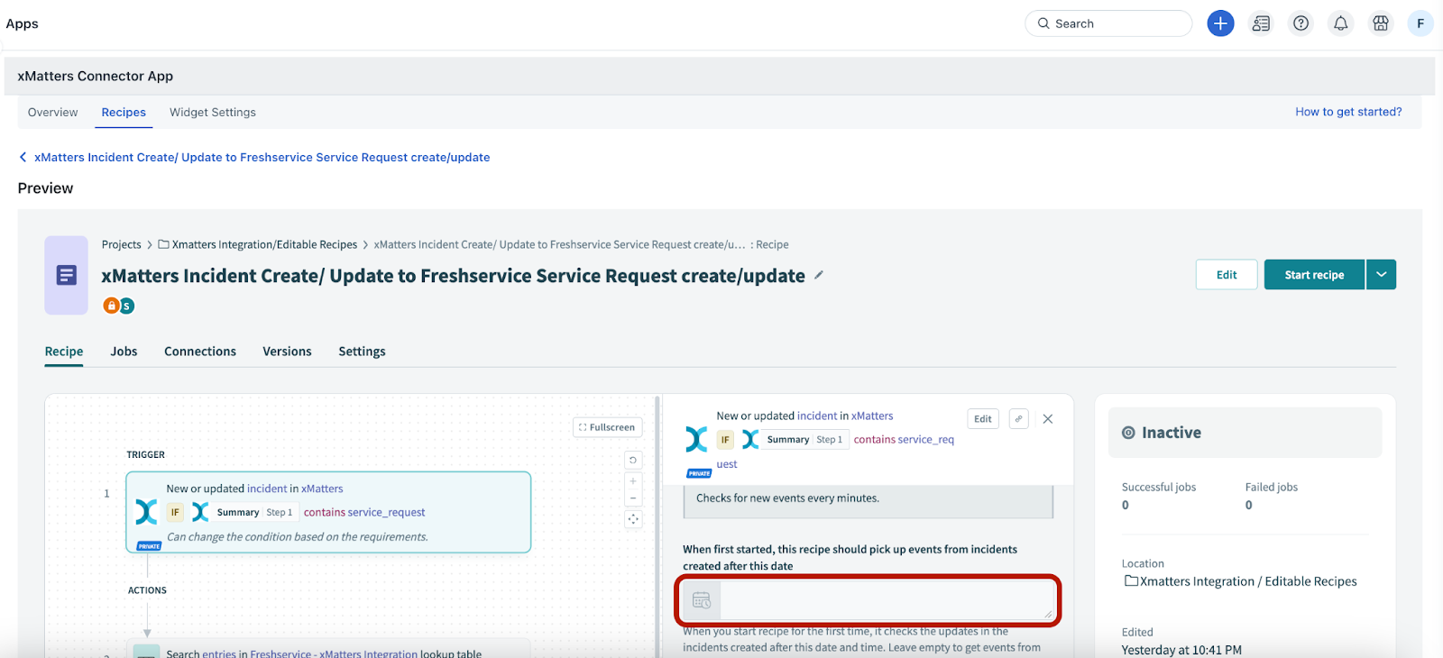 This recipe component acts as the starting point for any recipe. For this default recipe, the trigger is fetching a new or updated incident from xMatters and syncing it with a Freshservice service request.