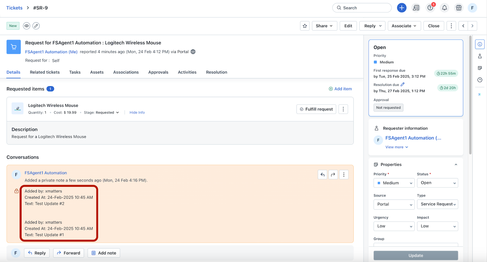 Note: The sync between xMatters incident timeline notes and Freshservice ticket notes is initiated only when an xMatters incident is updated. Therefore, xMatters to Freshservice notes sync is based on the xMatters incident update intervals.