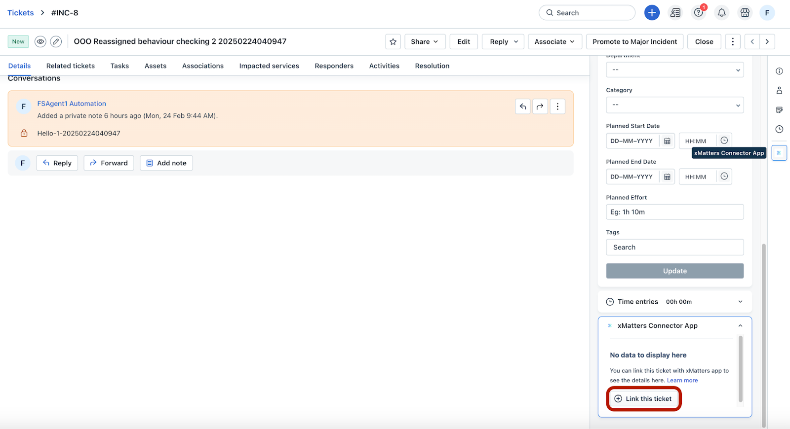Click Link this ticket in the xMatters Connector App widget (as shown in the following figure).