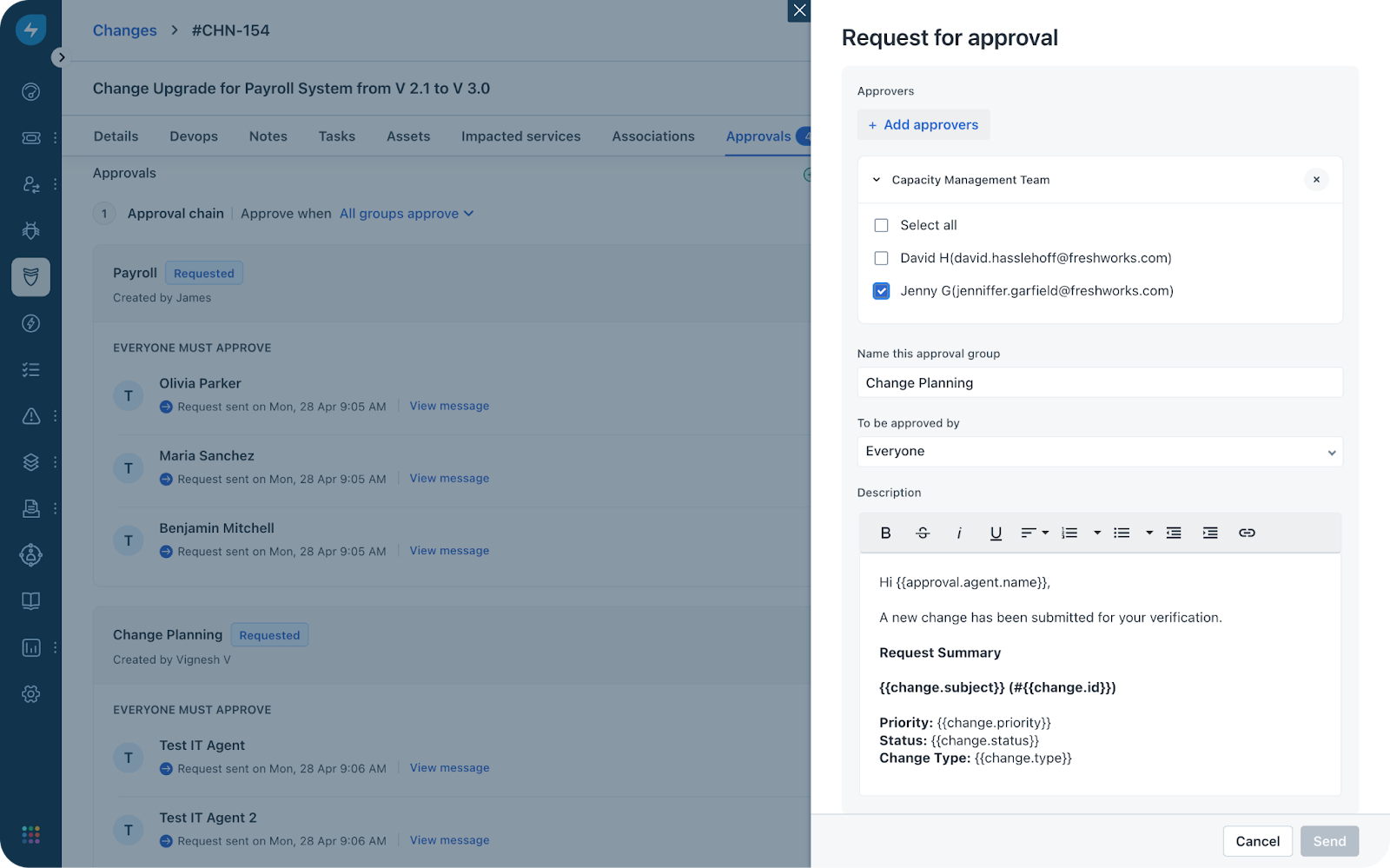 Approvers: An individual user who receives the approval request. These can be users such as department heads, reporting managers, agent groups, or users as a part of a change advisory board (CAB). Approvers can also be users of the impacted service.