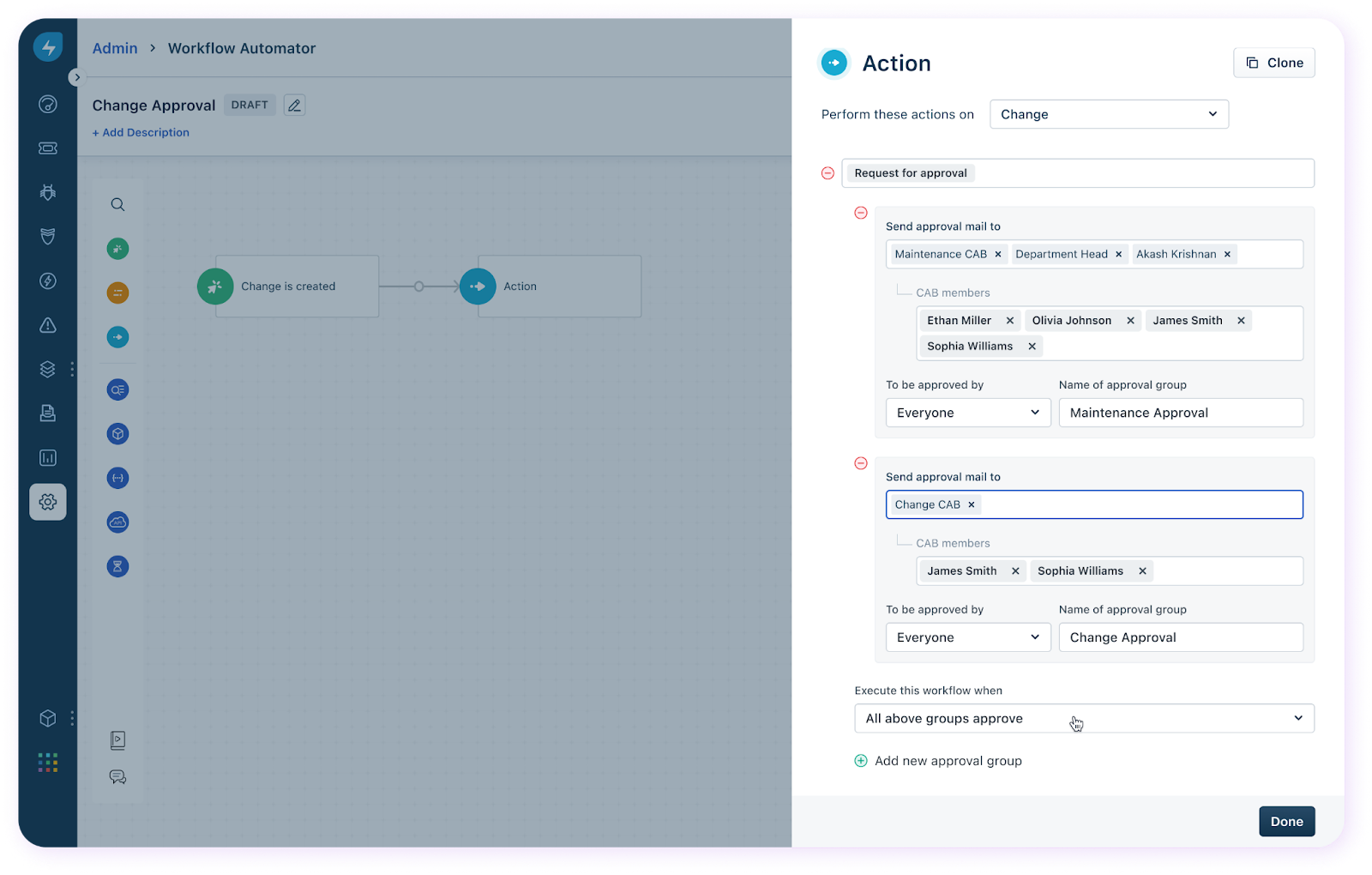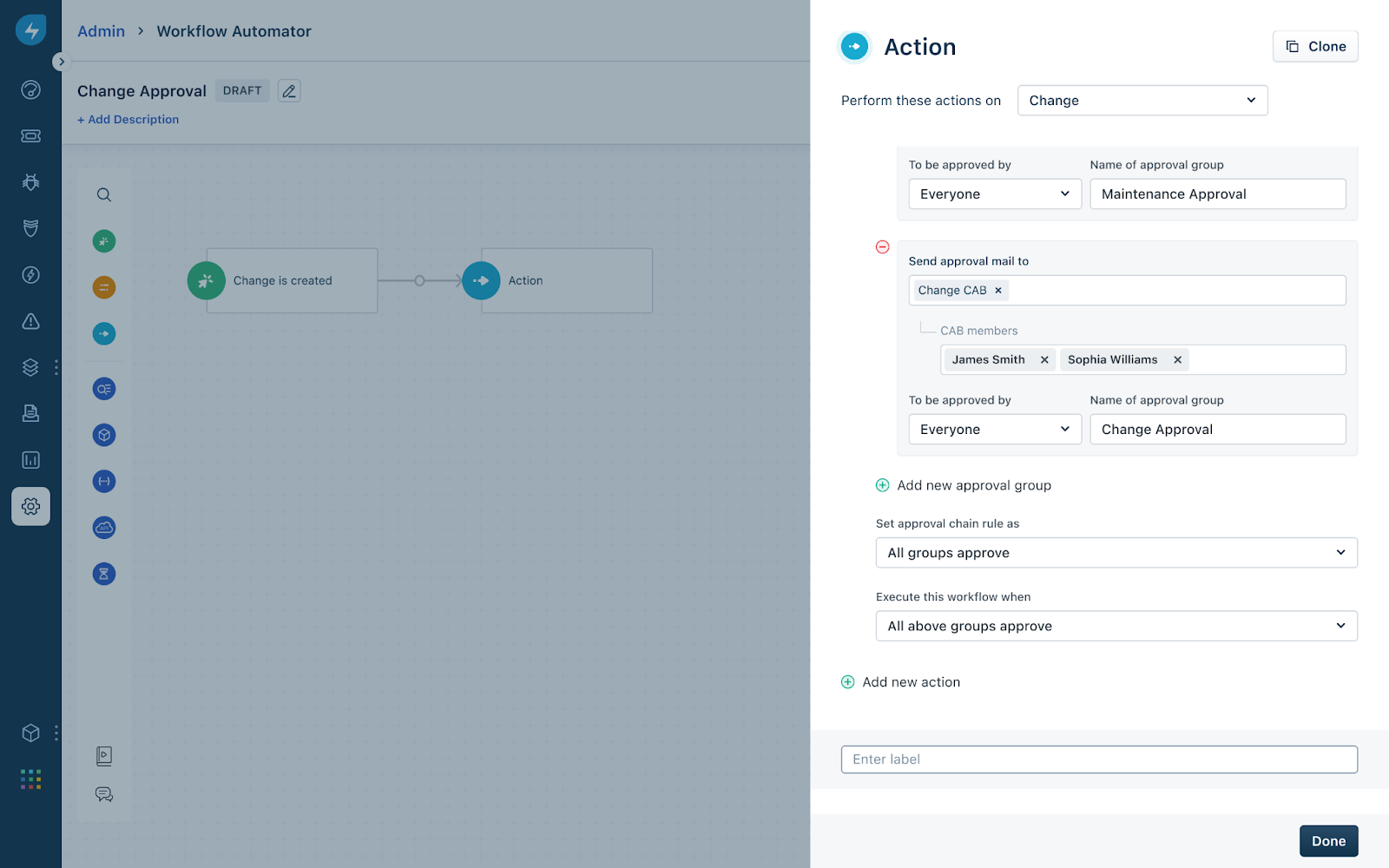 Approval chain: Approval chains aggregate approval groups. Each approval chain comprises groups that independently grant approval or rejection on a ticket/change. Here again, approval rules can be set for the chain: All groups approve, Any group approves, Majority of the groups approve, First responding group approves. Only when conditions set by the rules are met will the entire chain be considered approved. The process of approval within the groups can happen in parallel and in no particular order.
